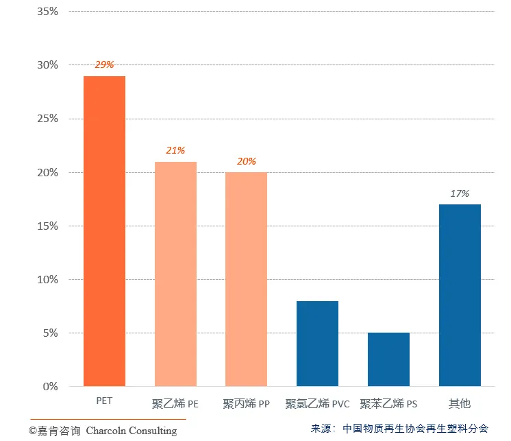 不同类别的商品塑料,其特性的差异影响其回收利用,每种类型的塑料都有各自的结构特点和物化性质,分别对应着不同的回收方法。目前企业主要针对热塑性合成树脂这类材料进行再生原料的回收利用。在国内塑料回收市场中 PET、PE和PP这三类塑料的占有率较高,分别为29%、21%和20%。