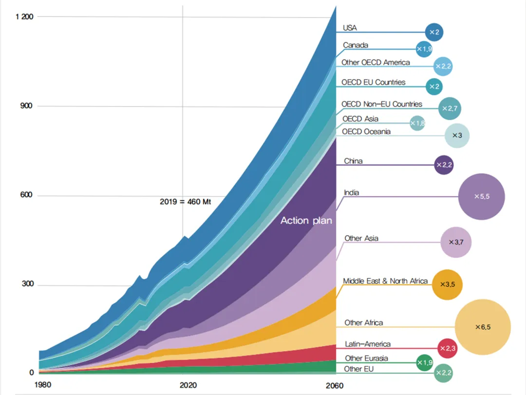 据 OECD调查报告统计,2019年全球塑料使用量为 4.60亿吨,预计到2060年将激增至12.31亿吨,使用量将增长近三倍。其中,印度等亚洲国家和非洲国家的使用量将大幅增长。
