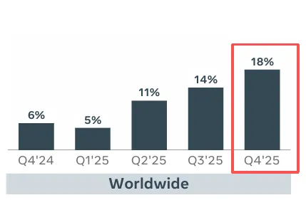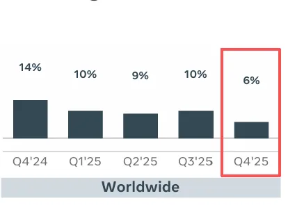 第四季度,Meta旗下的Facebook、Instagram、WhatsApp三款应用,平均每日活跃人数(DAP)达到35.8亿。更重要的是,AI推荐算法升级后,Instagram Reels的用户观看时长同比涨超30%,Facebook的视频观看时长也实现了两位数增长。流量多了,广告展示量就涨了18%;精准投放做得更好,又带动平均广告单价涨了6%。