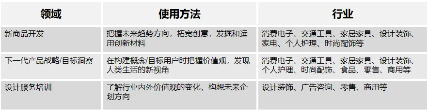 通过预测和运用设计趋势,可以帮助企业的研发、设计、市场团队,在开拓新产品、新业务及设计服务的时候,超前于眼前的潮流,用先行者的眼光,把未来带到眼前,提前一步创造出更符合消费者需求的产品。