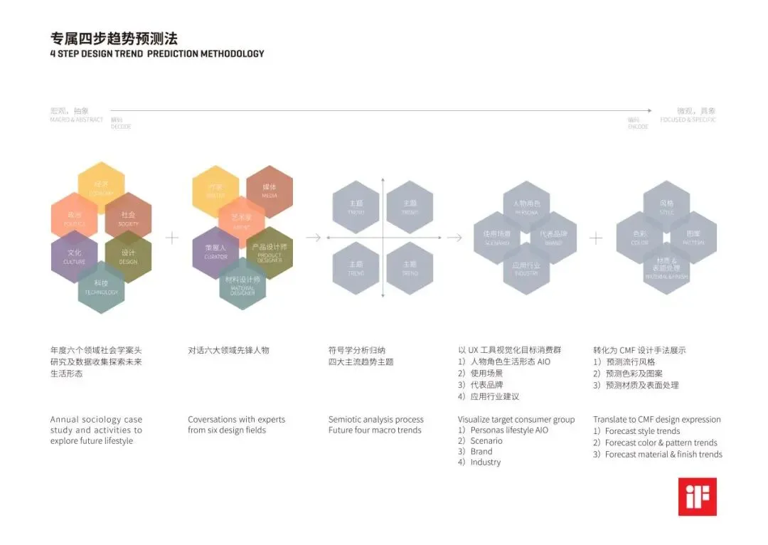 通过德国iF官网推荐的专属的趋势四步预测法,我们把宏观、抽象、概念性的趋势背景,转化为微观、具象、可见的设计手法,帮助品牌和企业把握未来趋势。