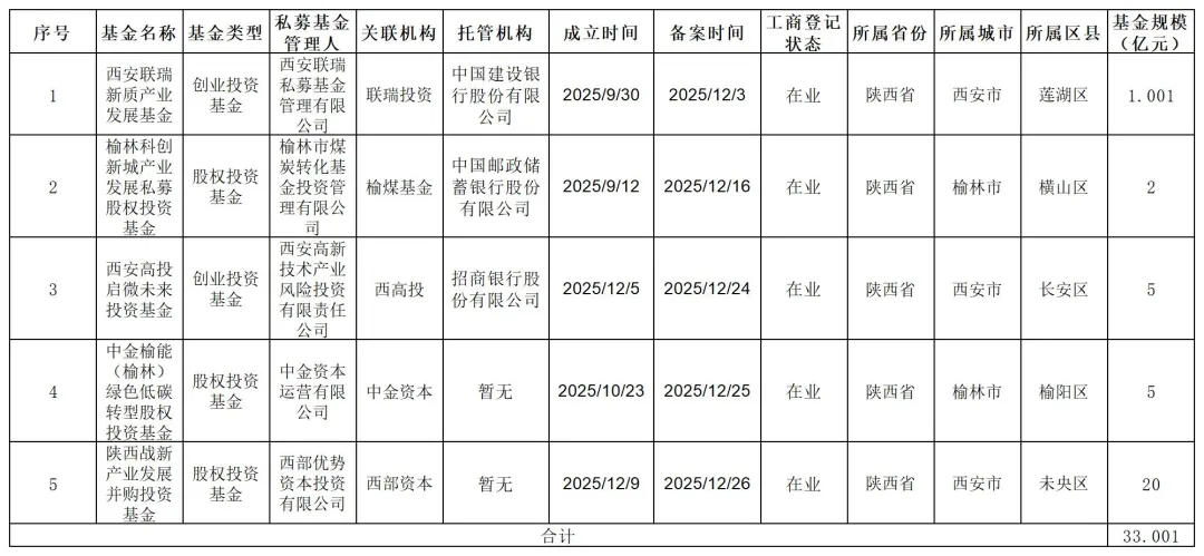 表2 陕西省新增股权、创业投资基金备案统计表(2025年12月)