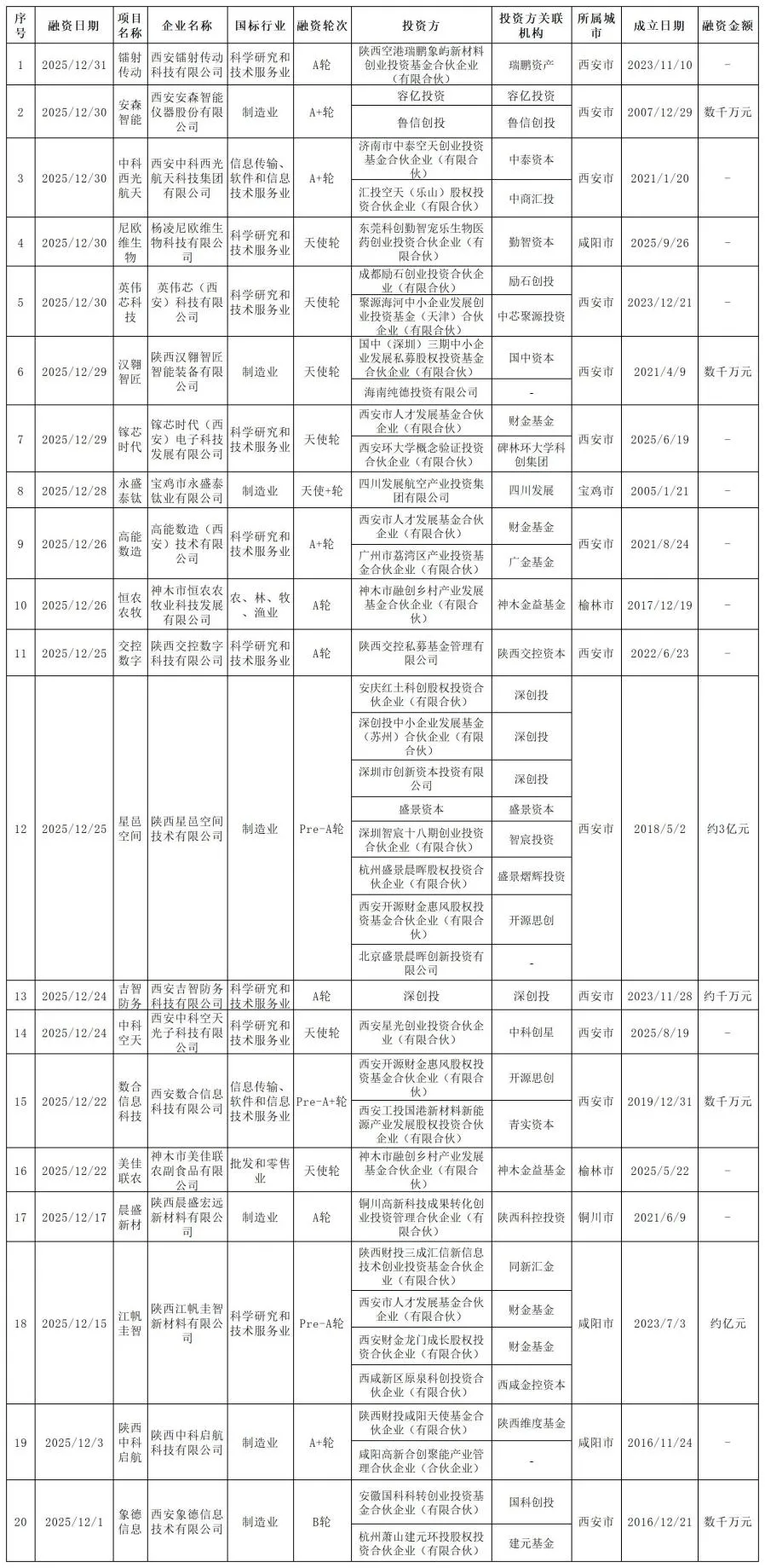 表3 陕西省2025年12月投融资事件