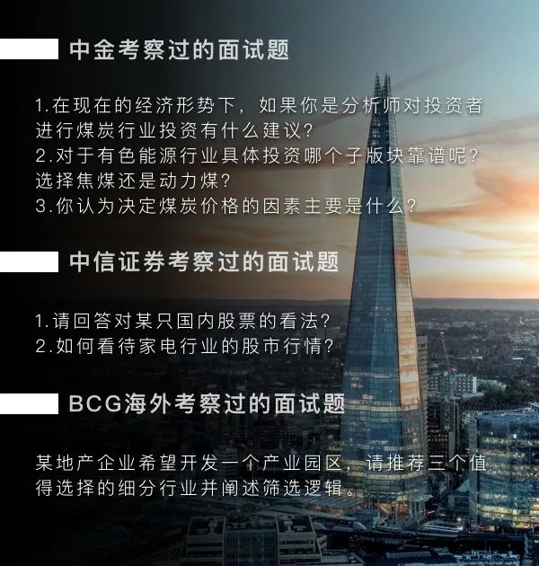 无论是从事金融领域还是咨询行业,行研思维和行业研究能力都是重中之重,而一份行研实习也是求职这两个领域性价比非常高的实习。对于券商投行等金融机构的行研岗来说 ,刚毕业就年薪20w+,工作5年年薪100w+,并不是什么异想天开的事。新财富排名榜单上的明星分析师都是年薪百万甚至千万,职业发展路径也是相当广泛。如此高收益的工作背后,自然离不开他们敏锐的行业分析能力。但券商行研部门每年招聘人数极少,想进入的同学都得跟清北复交优秀的同学同台竞争。除去学校背景,GPA等硬性指标,行研思维和行业研究能力其实是你当前最能够实现升级的技能之一,也是你进入高薪行业的入场券。如今越来越多的岗位也都在招聘中要求应聘者有行研能力或行研经验,实习工作中撰写行研报告更是家常便饭。2. “行业研究”既是笔面试必考,又是实习工作必用。行业研究能力作为券商投行、甚至咨询行业的基本功,无论是在笔试、面试还是实际工作中都是必须要深入掌握的。近几年各大公司在面试中经常考察行研相关的知识,想进券商投行或是咨询行业的同学,免不了和大批清北复交的学霸同台竞争。在笔、面试过程中,展现出比其他人优秀的行研能力,掌握碾压同龄人的行研思维,通过笔面试的胜算将会大大提升,求职过程中才能打动面试官脱颖而出。*上面这些问题,你是否可以快速给出面试官满意的答案?就拿咨询和券商中的实习工作举例,一般实习生的基础工作就是做搜集,做研究。如果没有好的“行研思维”和行研能力,做起事情来无疑是数据不知道从哪里找,看研报不知道从哪里开始找重点,画PPT甚至连框架都不知从何搭建......这种低效的工作模式,只能让自己好不容易拿到一份高质量实习,最终的结果却是留用无望。不进行行业研究的投资,就像打扑克从来不看牌一样,必然失败。