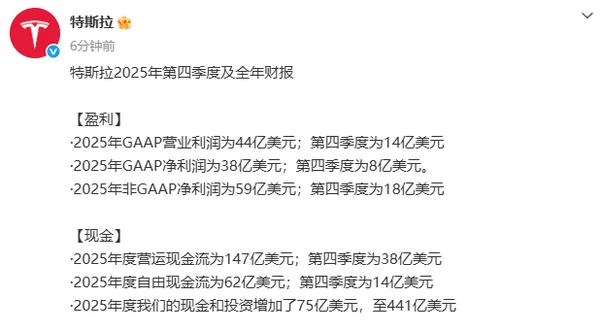 财报显示,按美国通用会计准则计算,特斯拉2025年第四季度总营收249.01亿美元,同比下降3%;归属于普通股股东的净利润8.40亿美元,同比大幅下降61%。全年总营收948.27亿美元,同比下降3%,为首次下滑;净利润37.94亿美元,同比下降46%。不过,在盈利结构上,2025年GAAP营业利润44亿美元,第四季度14亿美元;非GAAP净利润59亿美元,第四季度18亿美元,仍展现出一定韧性。