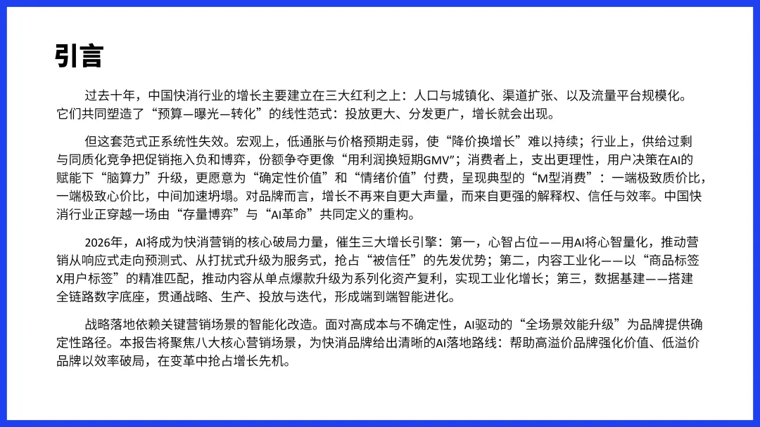 《2026快消AI营销增长白皮书》明确指出,2026年将成为快消行业AI营销的转折点,行业竞争将从简单的价格战和预算比拼,升级为解释权、信任与效率的全方位较量。