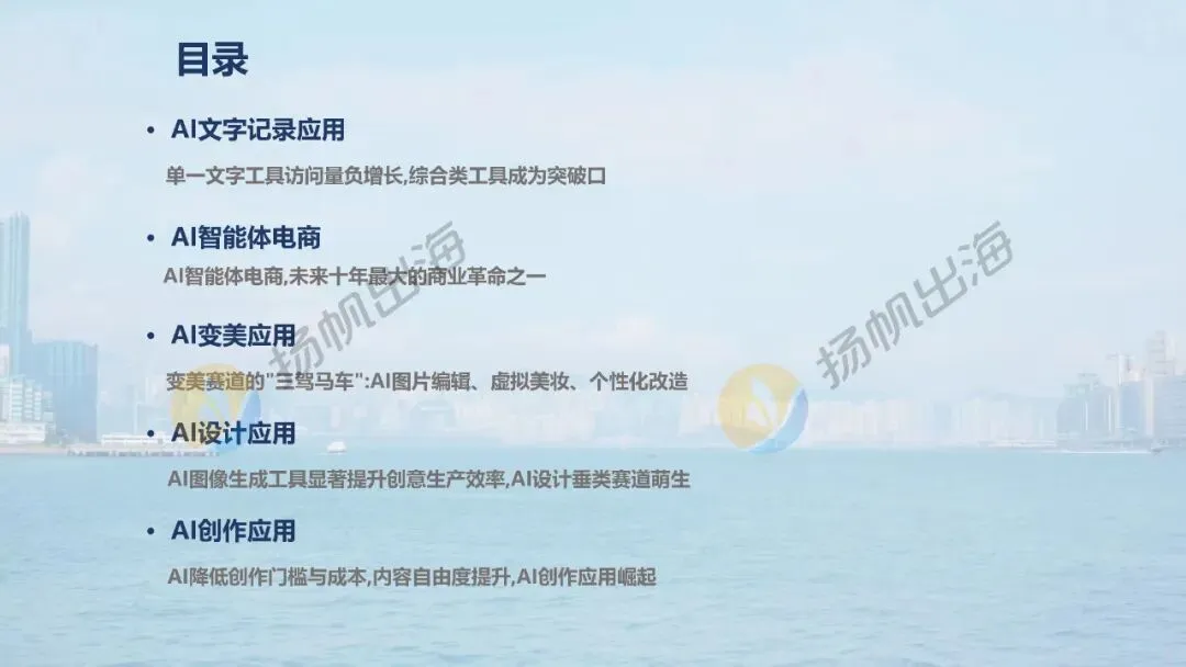 AI文字记录应用、AI智能体电商、AI变美应用、AI设计应用、AI创作应用