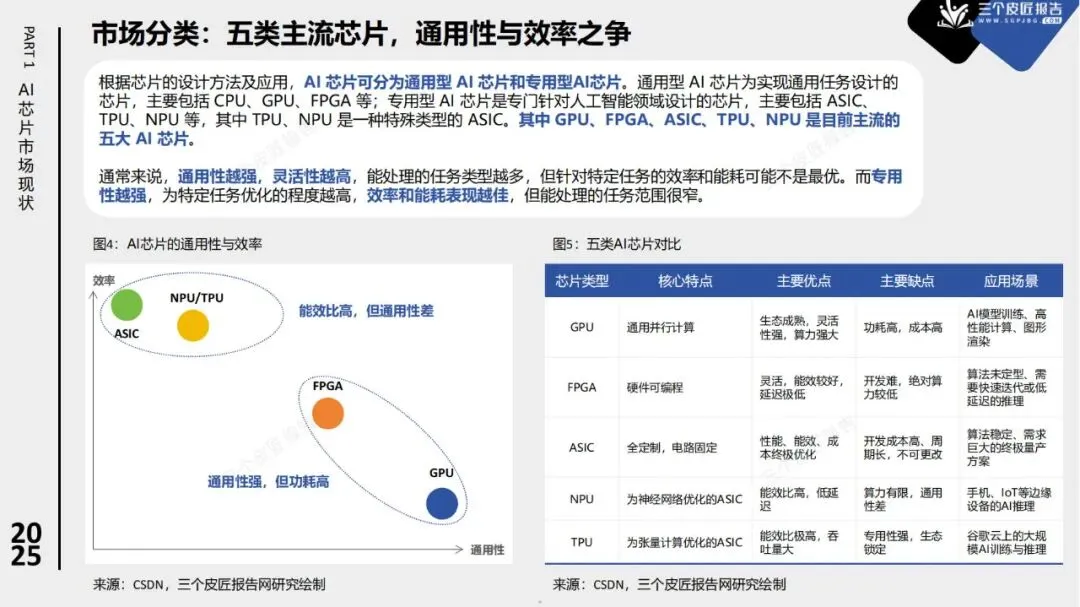 根据芯片的设计方法及应用,AI 芯片可分为通用型 AI 芯片和专用型AI芯片。通用型 AI 芯片为实现通用任务设计的芯片,主要包括 CPU、GPU、FPGA 等;专用型 AI 芯片是专门针对人工智能领域设计的芯片,主要包括 ASIC、TPU、NPU等,其中TPU、NPU 是一种特殊类型的 ASIC。其中 GPU、FPGA、ASIC、TPU、NPU 是目前主流的五大 AI 芯片。