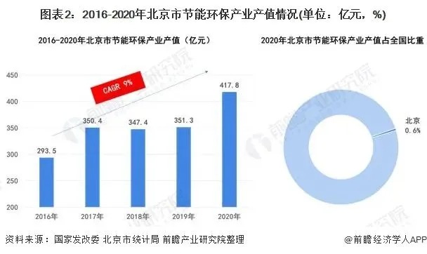 经过多年的发展,北京绿色能源与节能环保产业呈现出以节能环保关键技术和产品研发为支撑,以节能环保工程集成服务为主的综合性新兴产业。2020年北京市节能环保产业产值规模突破了400亿元,占全国总产值的0.6%,“十三五”期间的年均复合增长率达到9%。