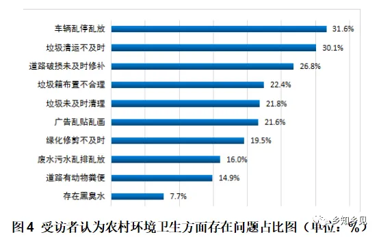 一是农村环境卫生方面:部分村民由于受传统生活习惯的影响,环境保护观念不强,仍存在乱扔乱倒、乱堆乱放现象。调查显示,车辆乱停乱放、垃圾清运不及时、广告乱贴乱画等6项问题在农村日常生活中较为严重,占比均超过20%(图4)。