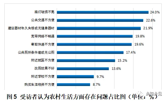 二是农村生活方面:调研表明,今年来我区农村公共基础设施建设有了极大改观,但仍存在一些问题,主要集中在路灯破损不亮、公共交通不便、健身器材年久失修等方面(图5)。