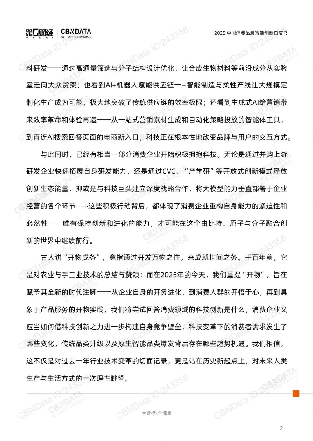 发布背景:2025年是中国“十四五”规划收官与“十五五”规划开局的关键节点,消费市场面临结构性变革,科技创新成为驱动高质量发展的核心动力。 主题“开物”:源自《天工开物》,寓意通过科技创新开发万物潜能,成就商业新局,反映中国消费产业从规模扩张转向价值导向的转型。 研究目的:为消费品牌提供智能创新的参照系与行动指南,助力企业穿越周期、实现可持续发展。