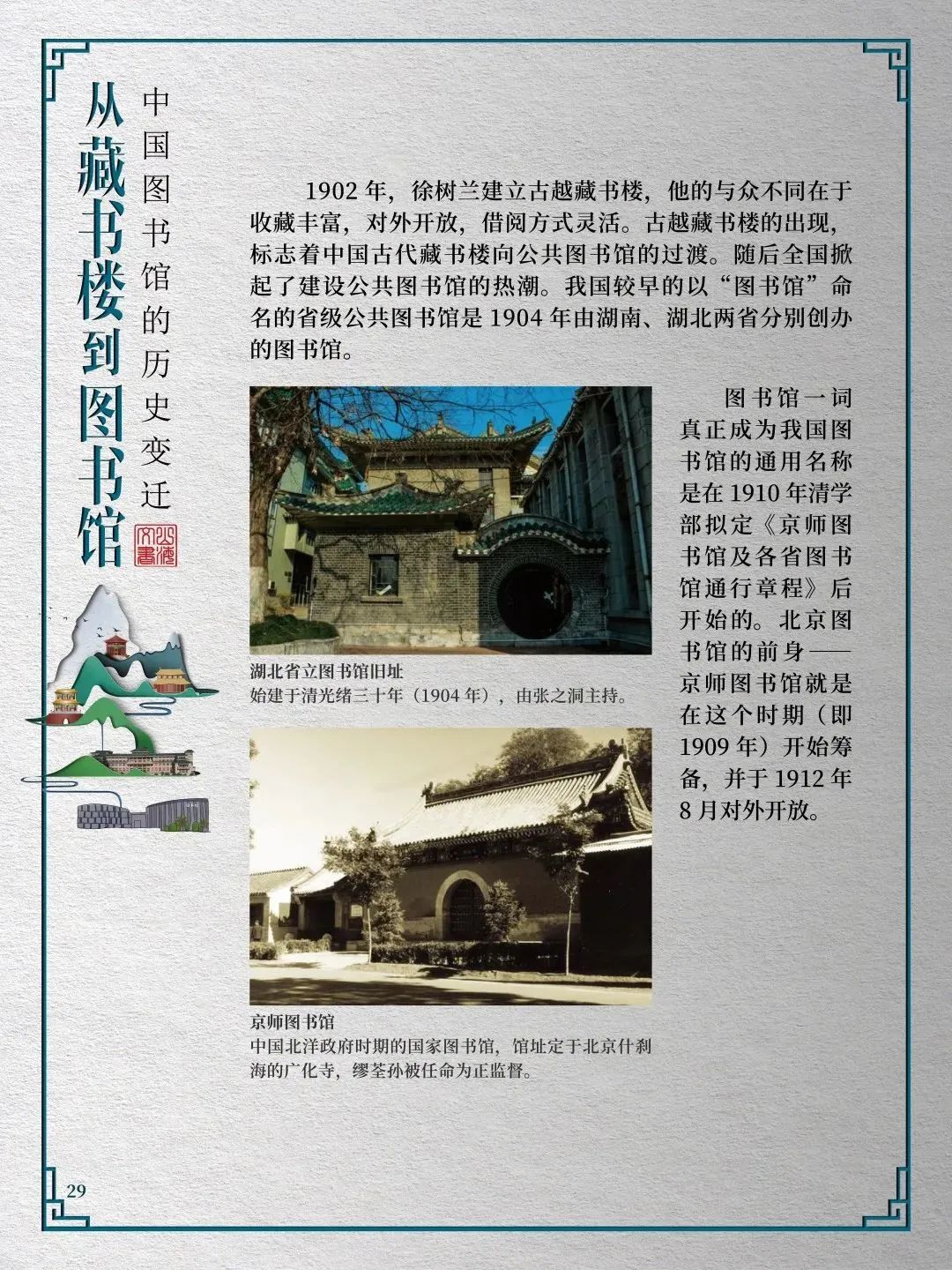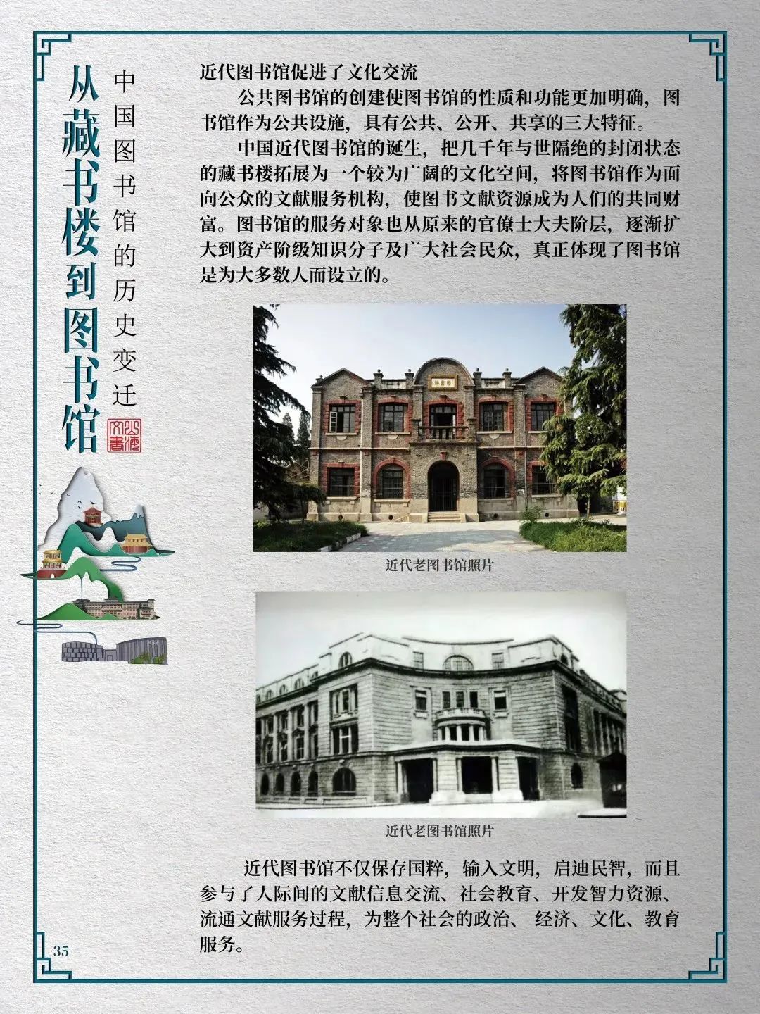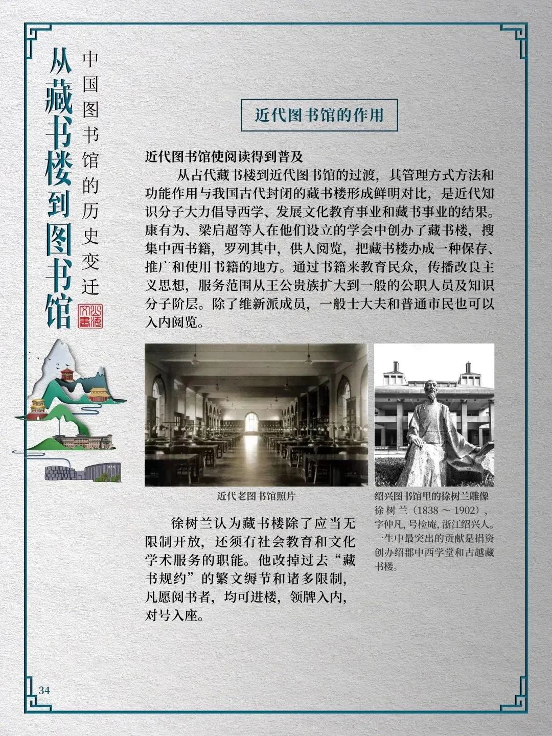 为此,莲池区图书馆举办“从藏书楼到图书馆——中国图书馆的历史变迁”展览,用图文并茂的方式同读者们一起探寻中国图书馆从古至今的发展轨迹,揭示华夏文明历经五千年风雨而延绵至今的文化基因。