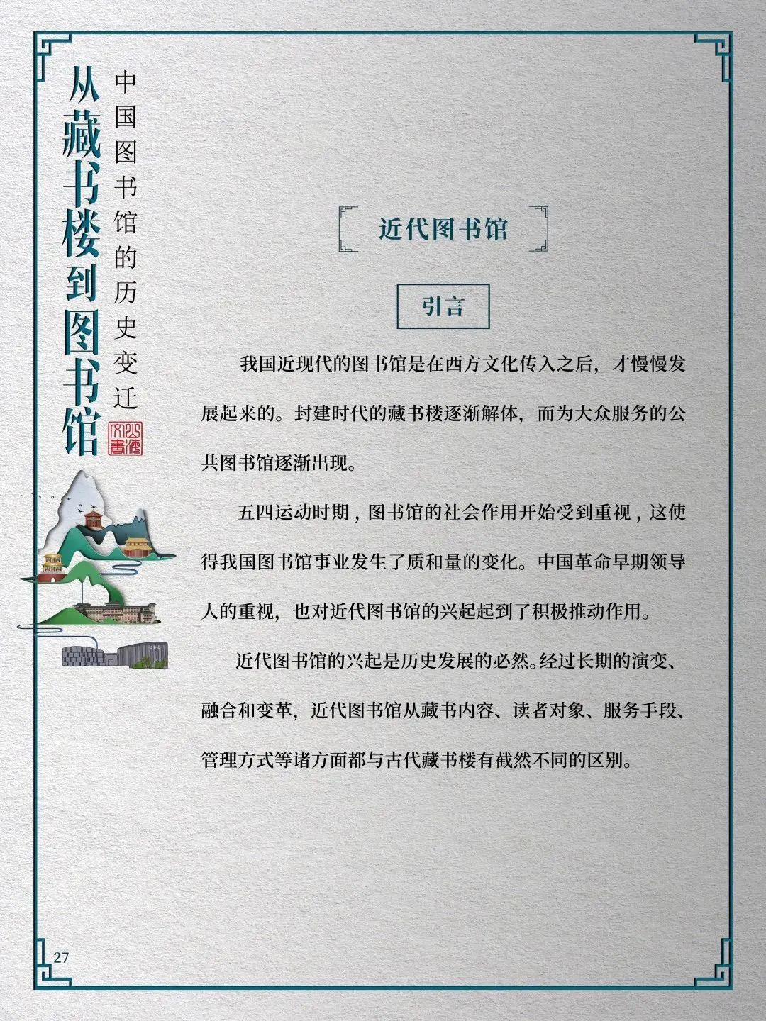人类之所以能够创造灿烂的文明,很大程度上是因为知识的积累。图书馆正是搜集、整理、收藏书籍资料、典籍图册以供人阅览、学习的机构。图书馆在保存人类文化遗产、开发信息资源、参与社会教育等方面功不可没。