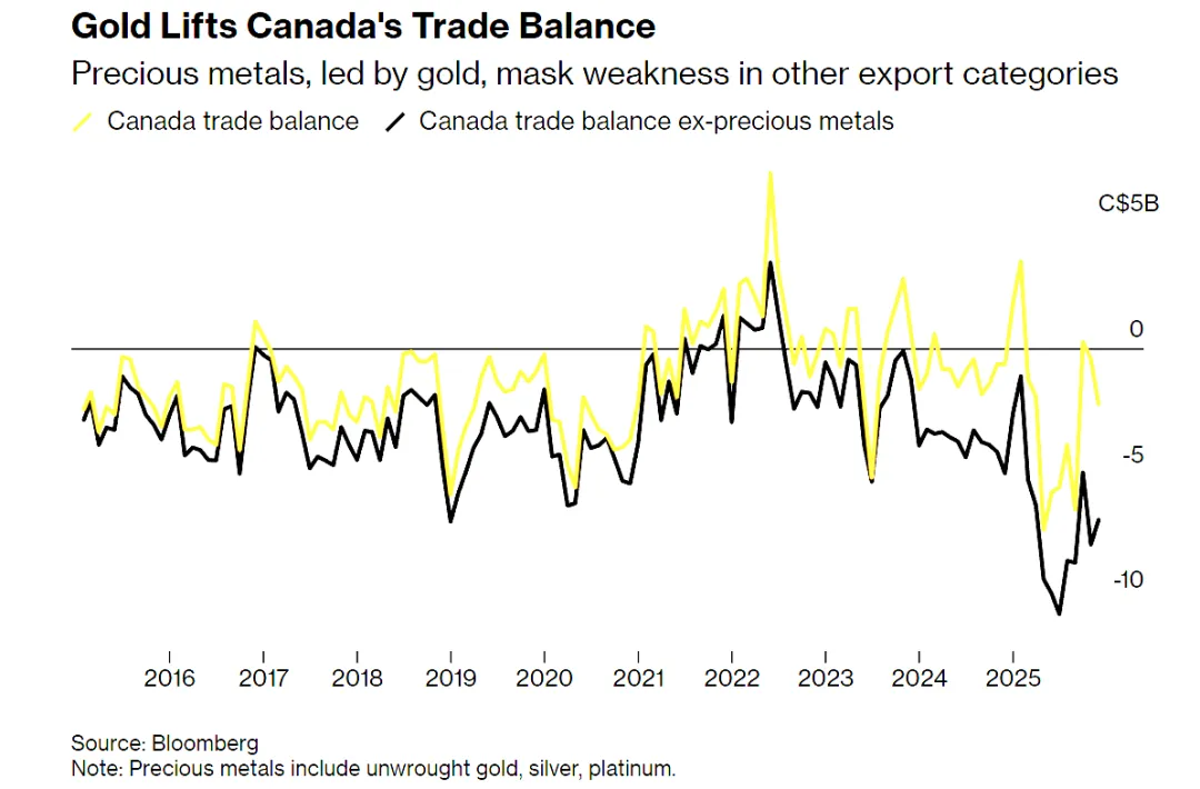 - •宏观贸易:加拿大贸易逆差扩大至 22 亿加元,黄金出口波动影响了整体数据,汽车出口受芯片与贸易环境双重影响出现下降。