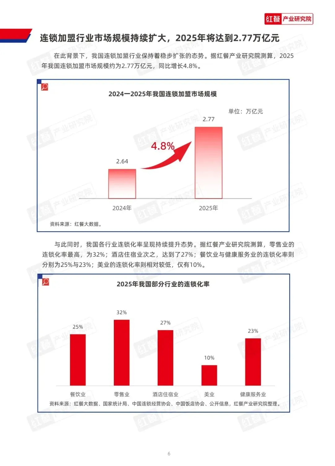 行业结构:餐饮业占比近五成,是加盟市场的主力赛道;零售业为第二大行业,占比24.2%;居民服务业、教育培训业等其他行业占比相对较少。加盟模式已深度渗透至多元业态,覆盖生活服务各场景。 连锁化率:零售业连锁化率最高,达32%;酒店住宿业次之,为27%;餐饮业与健康服务业分别为25%与23%;美业连锁化率相对较低,仅10%。各行业连锁化率呈现持续提升态势。