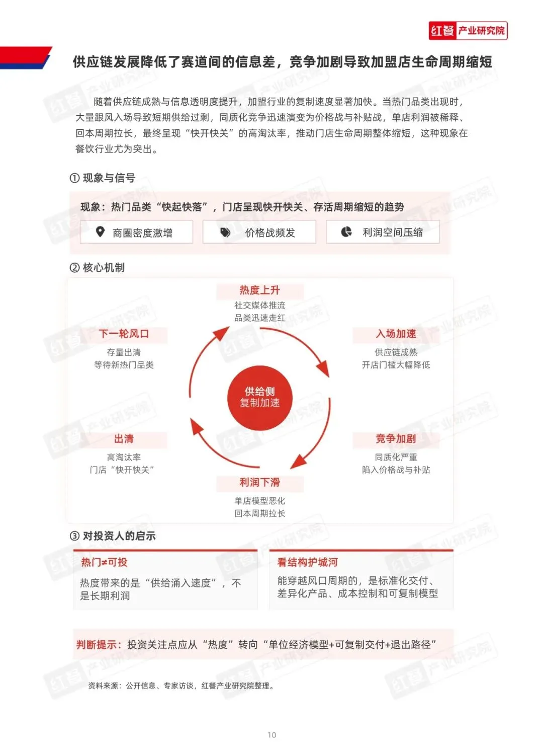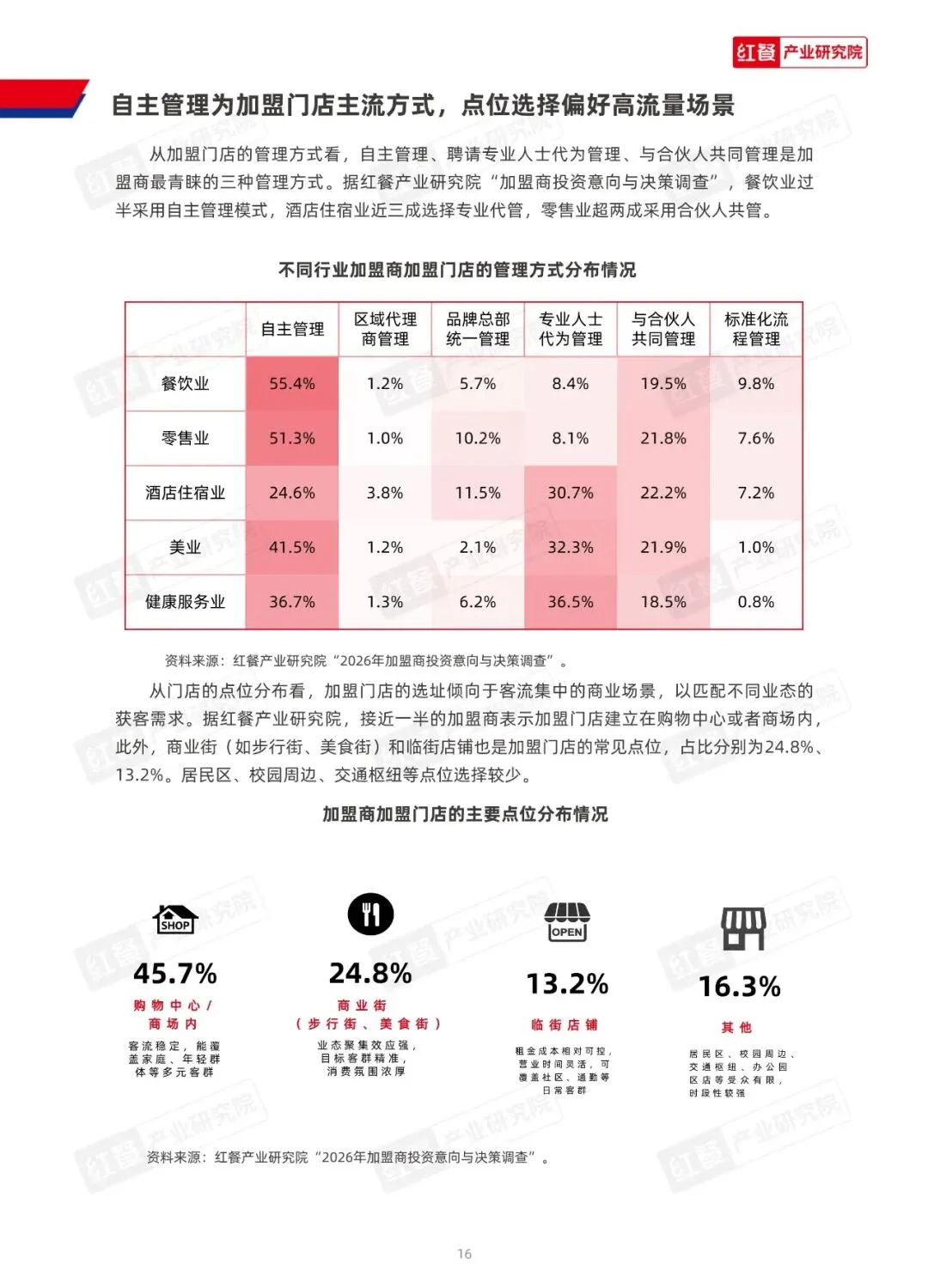 品牌盈利逻辑转变:品牌方盈利模式从传统加盟费转向供应链溢价。传统模式以一次性收费为核心,易存信任风险;新模式通过集中采购、物流配送等供应链服务获利,与门店经营健康度深度绑定,形成良性商业生态。 加盟模式转型:“快招”模式逐步出清,行业向“品招模式”转型。加盟商投资逻辑更关注合规性、可持续性及品牌实力。 加盟商经营现状:加盟商趋向精耕细作,近90%布局2个及以上品牌,63.1%聚焦单一行业深耕。单店投资多集中在51万-100万元区间,毛利率因业态分化,美业、酒店住宿业居前。门店存活率稳固,98.2%仍有门店营业,回本周期受业态影响显著,美业最短,酒店住宿业最长。选址偏好购物中心、商业街等高流量场景,管理以自主管理为主。