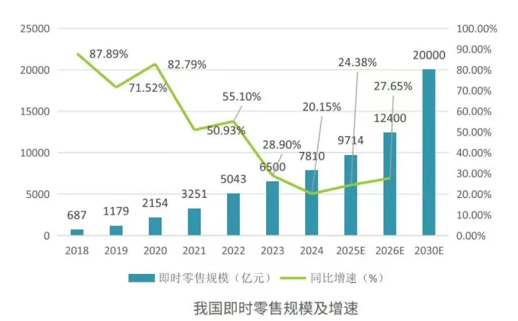 近年来,我国即时零售规模持续扩张,2024 年我国即时零售规模达 7810 亿元,同比增长 20.15%,比同期全国网络零售增速高出 12.95个百分点,比同期社会消费品零售总额增速高出 16.65 个百分点,即时零售已成为我国零售业增长的新动能。目前,我国即时零售正处于迈向万亿级规模的关键节点,2026 年我国即时零售规模将突破1 万亿元,预计到 2030 年,将达到 2 万亿元,“十五五”期间年均增 速将达 12.6%。