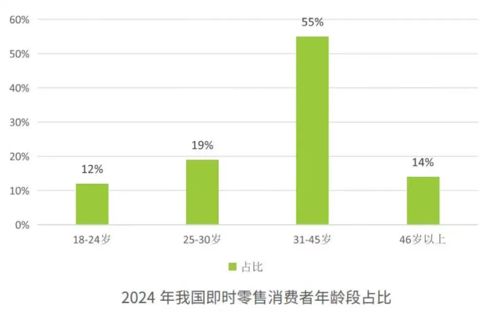 据第三方机构调研,2024 年,我国即时零售 31-45 岁消费群体占比达 55%,比 2023 年增加 5 个百分点。从平台数据来看,青年消费者占主导,美团闪购数据显示,90 后占比超过三分之二(截至 2025 年 3 月);淘宝闪购数据显示,25-40 岁用户占比超过 60%(截至 2025 年 7 月)。这些年轻人不仅消费频次高,还愿意为品质、服务买单,比如深夜零食、美妆小样、健康低卡产品,都是他们的高频消费项,也带动了品类的丰富和升级。
