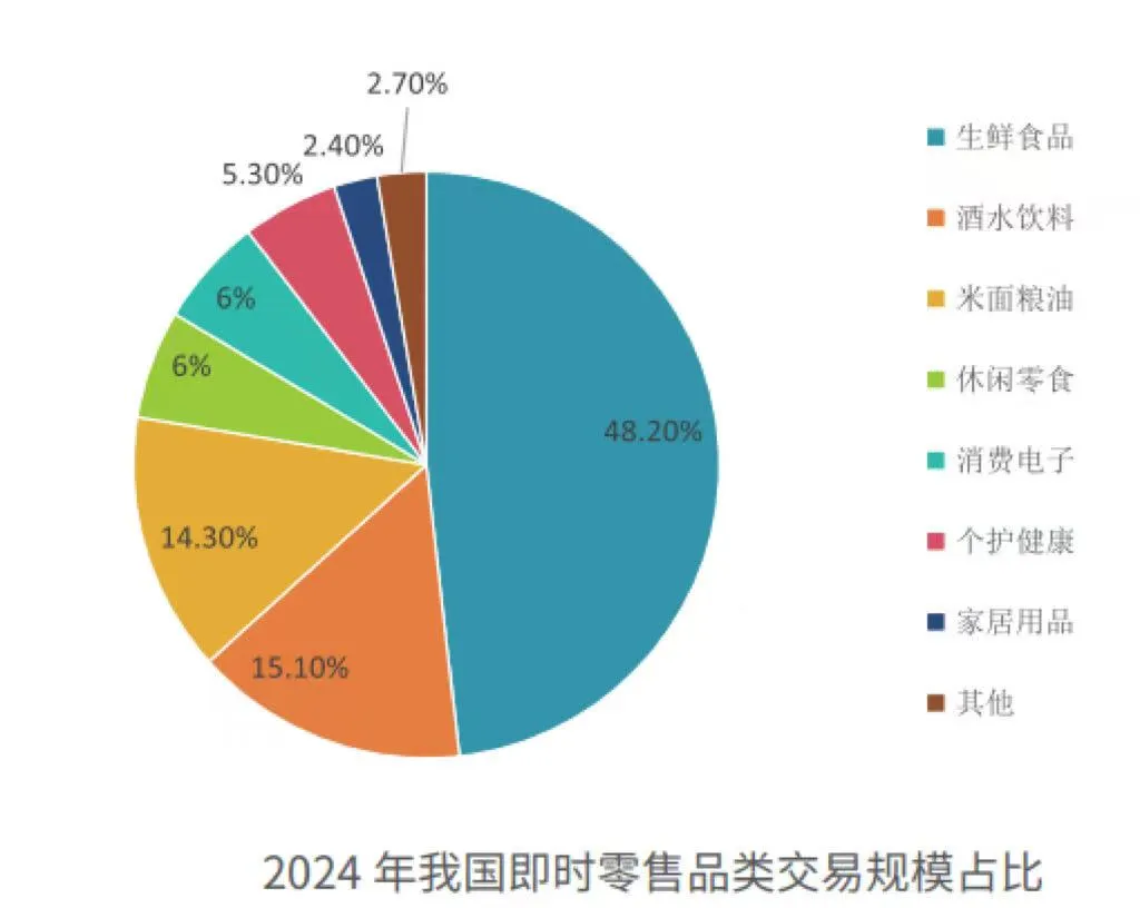 目前即时零售已经从应急场景向日常 采买、旅行、出差、办公、家居休闲、节日、校园等多个场景拓展,品类已经覆盖生鲜食品、 酒水饮料、米面粮油、休闲食品、消费电子、个护健康、家居用品等,满足居民日常生活工作社交所需。2024 年,品类上生鲜食品占比 48.2%,位居第一, 其次是酒水饮料和米面粮油,占比分别为 15.1%、14.3%,然后是休闲零食,占比 6%。从 SKU情况来看,百货类前置仓 SKU 约为 6000 ~ 8000 个,覆盖快消品、 日用品等高频需求,宠物、美妆等垂直品类前置仓 SKU 约为 3000 ~ 5000 个,主打细分需求,能满足各种个性化需求。