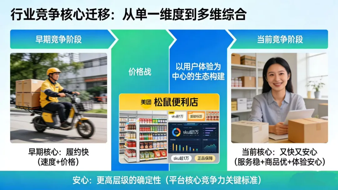 行业竞争的核心,发生了根本性迁移。早期拼的是 “履约快”,是速度和价格,如今,用户的核心诉求已演变为 “又快又安心”。行业竞争的核心正从单纯的价格战,全面转向以用户体验为中心的生态构建。