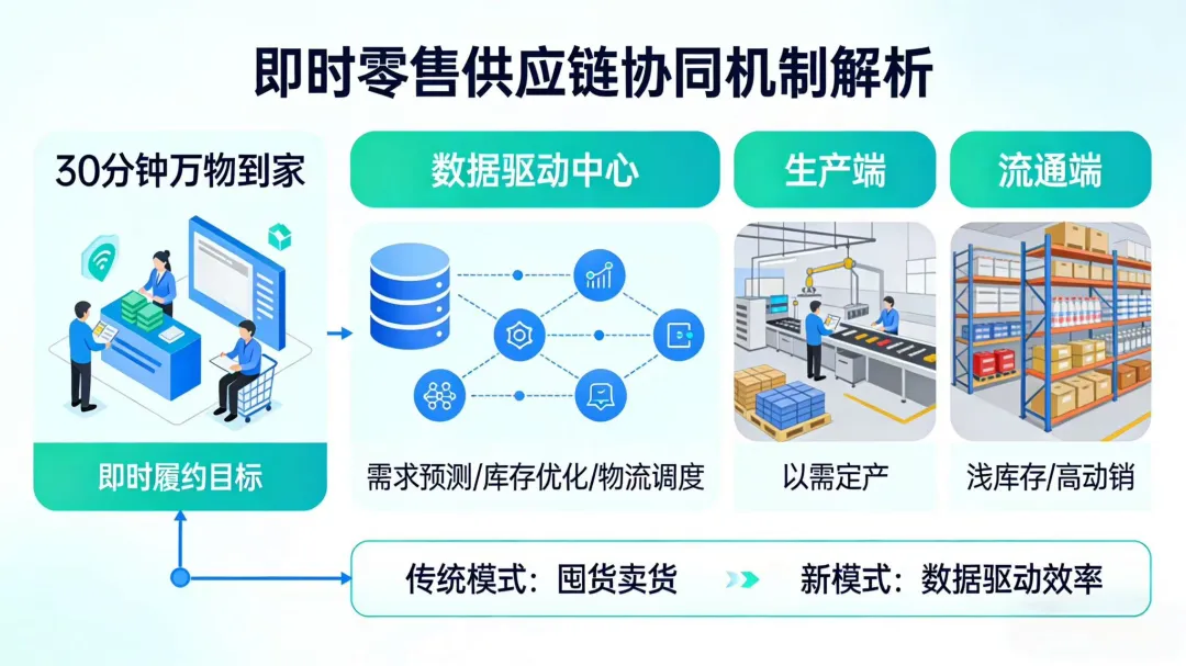 即时零售能做到 “30 分钟万物到家”,背后的供应链协同功不可没。现在的供应链早就不是 “囤货卖货”,而是 “以需定产、浅库存、高动销”,靠数据驱动效率。