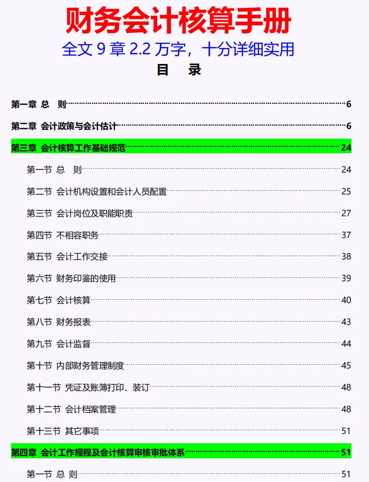 在财务工作中,你是不是常常遇到公司核算制度太乱,总是出现财税风险,不管是财务基础岗位还是财务管理者,核算制度建立是第一步,做好账务核算是风险防控的第一步,今天分享一份不错的财务会计核算手册共9章,非常全面,可结合实际取其精华收藏学习,具体内容如下: