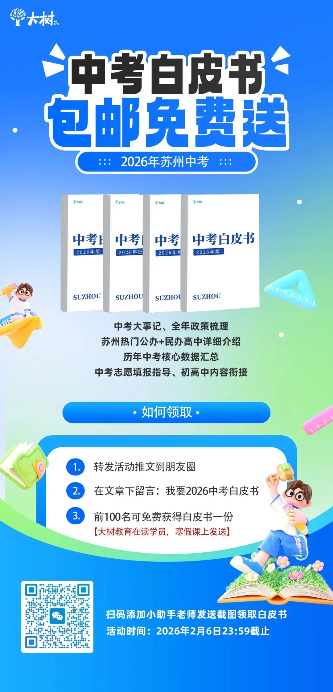 2026中考白皮书由大树教育深耕中考领域的初升高团队耗时数月、精心编纂打磨而成,近8万字“保姆级”干货、中考关键名词解释、中招政策变化、历年中招数据汇总、定向生、自主招生、志愿填报、中考录取...用通俗易懂的语言,帮助家长同学们更轻松快速的了解苏州中考政策!