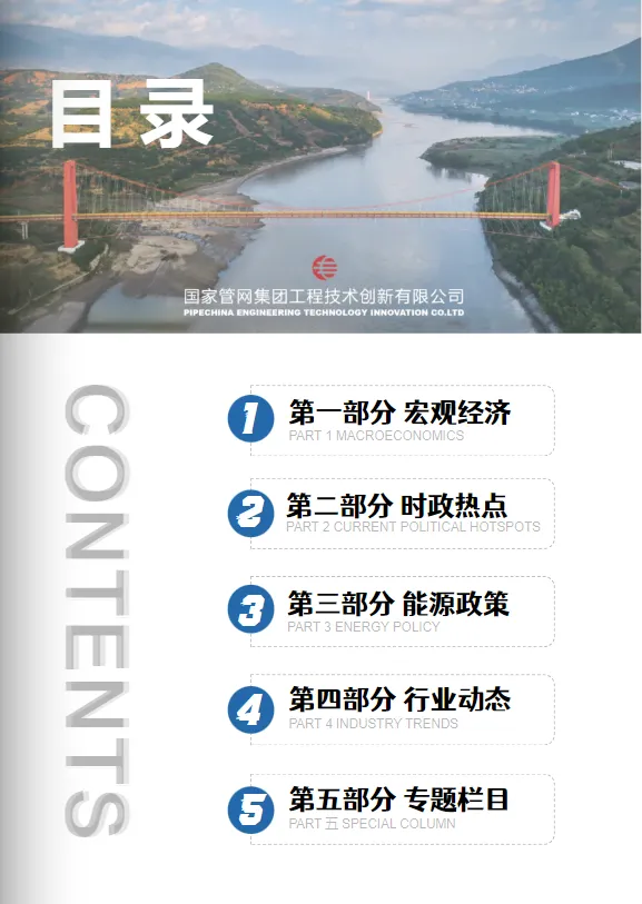 政策经济月报涵盖了国际国内宏观经济形势、时政热点话题、能源政策解读、天然气行业动态及业务资讯等内容,以月刊形式面向公司及行业发布,诚邀读者朋友们交流探讨、共谋行业发展。