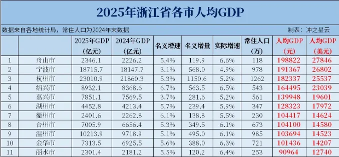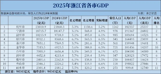 2025年浙江省各市经济总量保持“杭州领先、宁波紧随、温州破万亿、其余城市梯次分布”的格局。此外,2025年浙江人均GDP已达1.99万美元,距离2万美元大关仅一步之遥。