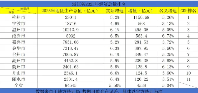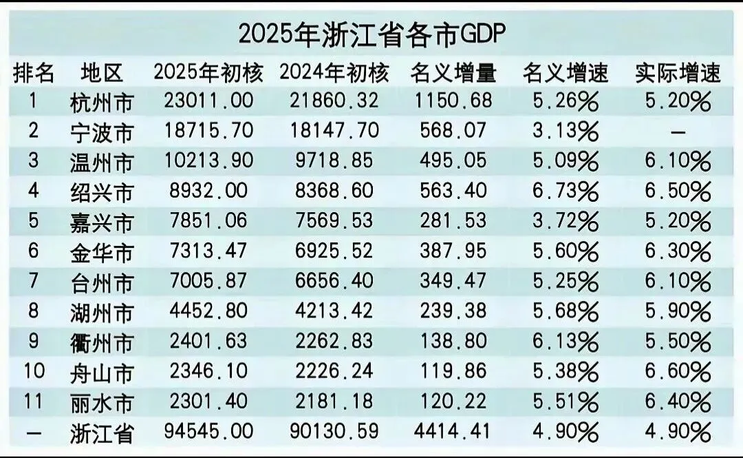 2025年,浙江省GDP实现9.45万亿,实际增速和名义增速分别为5.5%和4.9%,比全国高出0.5和1.0个百分点。近日,随着浙江省11个地级市陆续发布2025年成绩单,浙江形成了GDP“三‘万亿’+四‘准万亿’+四‘加速极’”的城市梯度新格局。