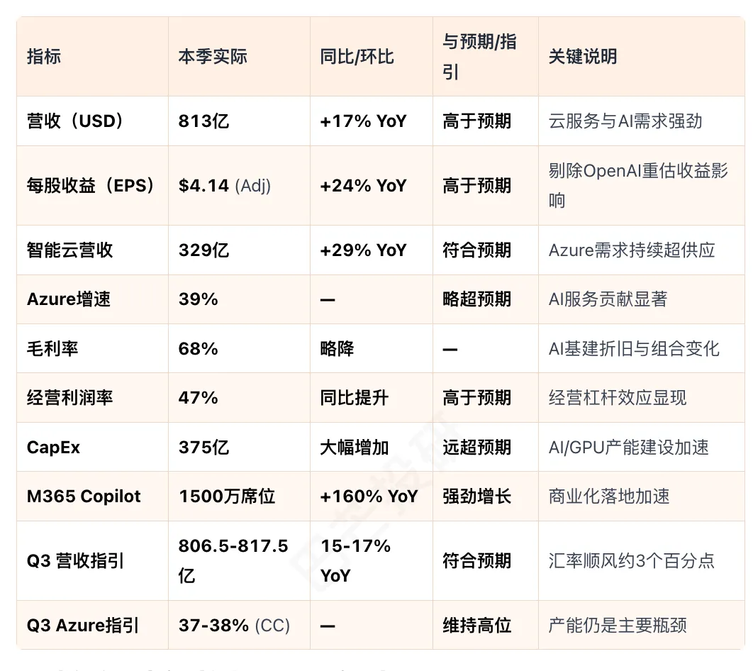 而微软打的是AI资本开支加速加云增速边际放缓”(利润很强,但短期现金回报率被Capex压下去,且Azure指引不再上修)。