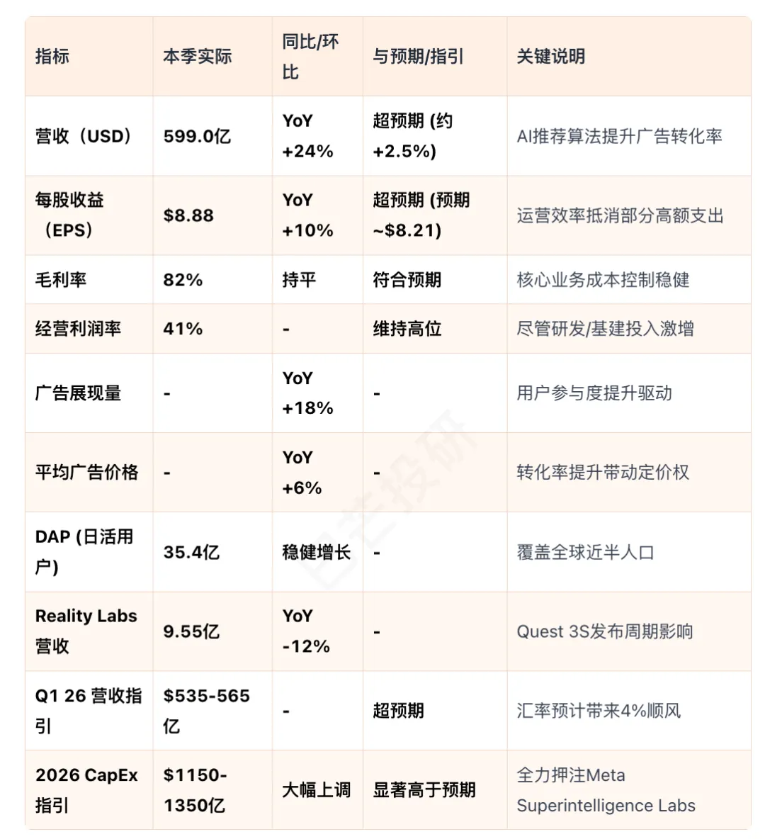 本季度 Meta 业绩表现强劲,全面超出华尔街预期。营收端录得 599 亿美元,同比增长 24%(按固定汇率计算增长 23%),显著高于市场预期的 584.5 亿美元。这一增长主要由核心广告业务驱动,广告收入达 581 亿美元,其中广告展示量增长 18%,平均广告价格增长 6%,显示出量价齐升的良好态势。