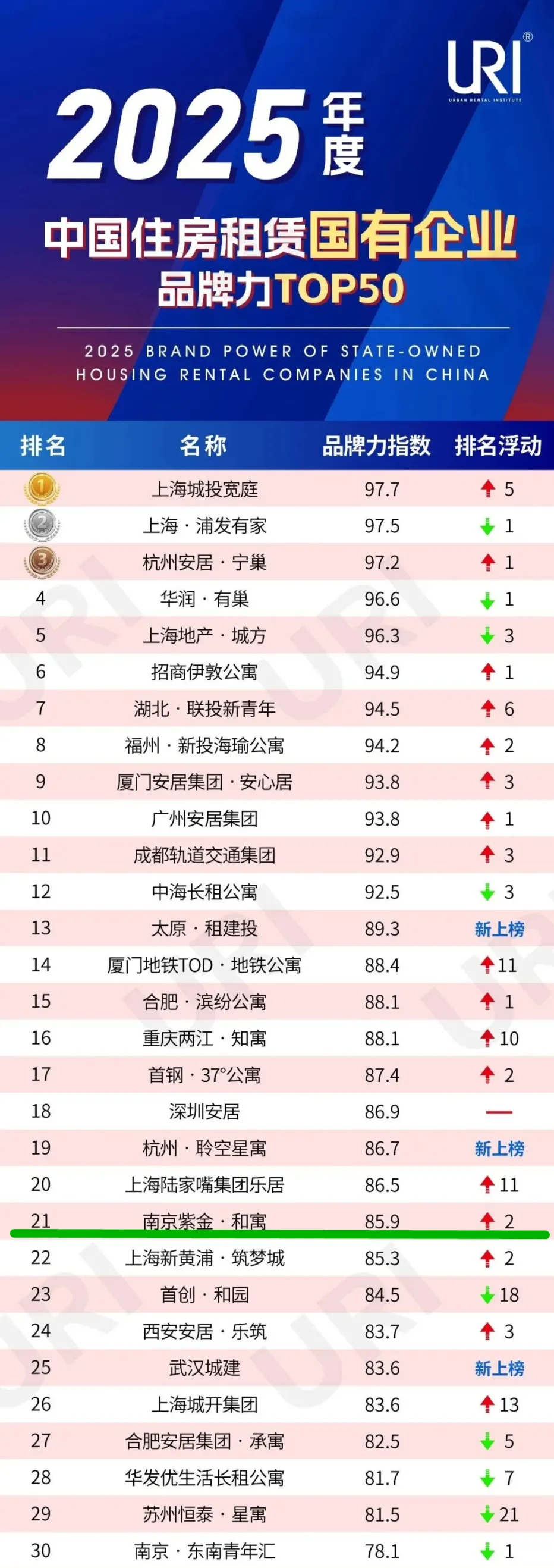 在URI城市租住发布的2025年度中国住房租赁国企品牌力TOP50榜单中,紫金和寓凭借稳健的运营体系、优质的租住服务与突出的民生贡献,成功跻身第21位,迈入全国租赁品牌第一梯队。项目同时积极探索低碳租住模式,以绿色运营理念引领行业风尚,成为南京国企租赁品牌的杰出代表。