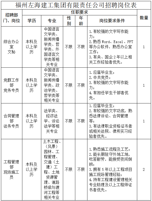 福州左海建工集团有限责任公司(以下简称“左海建工集团”)为福州市属国有企业。公司以“建一流工程,创名牌企业”为宗旨,着力推进投资、建设、运营养护一体化创新模式,在深耕“交通建设”主责主业的同时,构建涵盖交通、机场、港口、铁路等重大基础设施建设及新能源等传统与新兴产业相互动的业务板块。因业务发展需要面向社会公开招聘专业人才,现将有关事项公告如下: