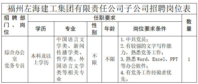 福州左海建工集团有限责任公司及子公司共招聘人员6名,具体岗位招聘条件详见附件1、2。