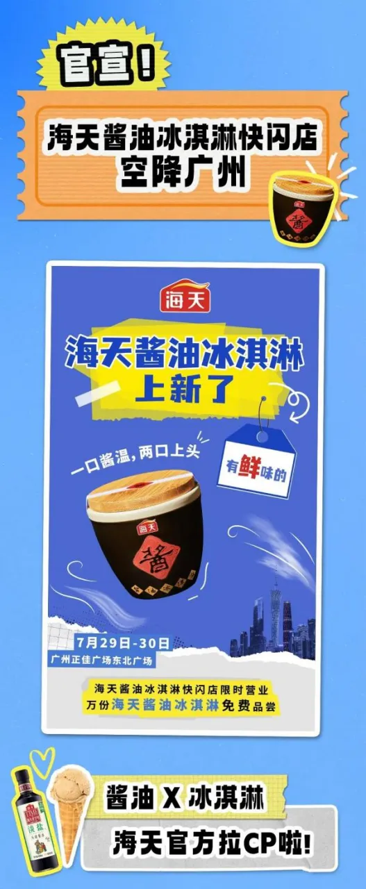 炎热的夏天,谁能拒绝一口凉爽的冰淇淋呢?2023年7月27日,300年的老字号品牌海天跨界推出酱油冰淇淋,不仅在其中加入了真酱油,还将酿造酱油的原料——东北非转基因黄豆研磨的黄豆粉搭配冰淇淋来吃,让口感更丰富醇香。