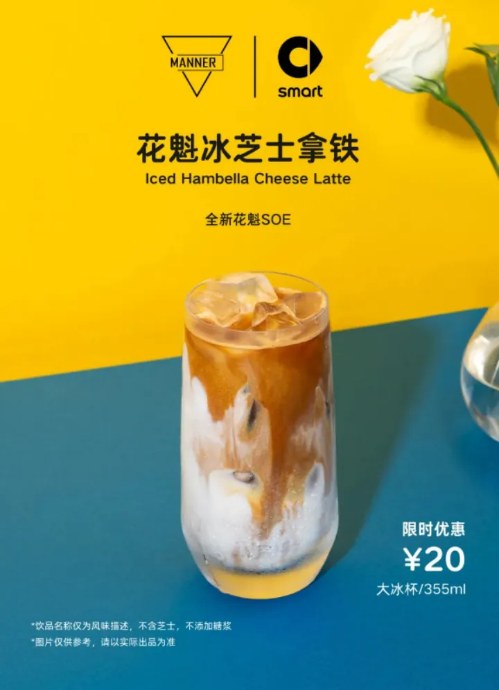2023年7月27日至8月6日,MANNER与smart正式官宣合作,联合推出夏日限定风味饮品“smart拿铁”,呈现“我的夏日密友1+1”特别企划。合作产品在MANNER全国门店限时上新,并共同打造smart × MANNER“密友主题店”,活动期间下单购买一杯联名饮品或参与线下活动,就有机会获得“聪明杯”套装和“吨吨杯”等联名周边,给受众创造一个和朋友见面、交流的机会。