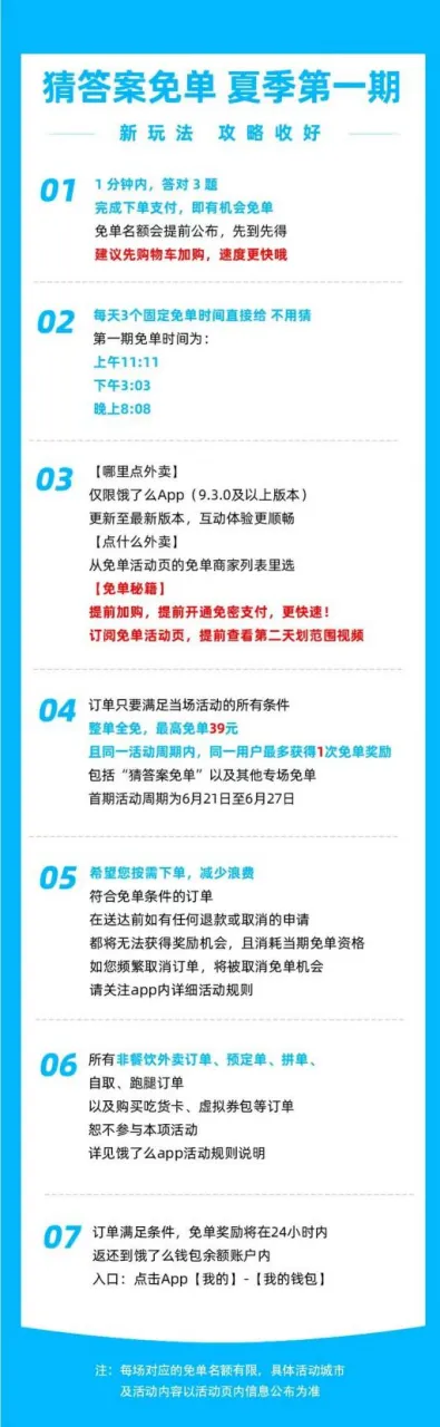 2023年6月20日,饿了么官方正式宣布夏季猜答案免单活动继续回归。这一活动始于2022年6月21日,当时具体玩法是消费者根据平台出题的线索猜答案,在指定时间内完成下单,即有机会在订单送达后获得免单资格。