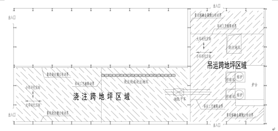 (3)“地坪区域”是指横向以熔融金属吊运跨或者浇注跨两侧立柱靠近熔融金属吊运侧的立柱边线为界,纵向以吊运跨或者浇注跨两端围墙为界的车间内正负零面区域。其中,“横向”是指吊运熔融金属起重机的小车运行方向;“纵向”是指吊运熔融金属起重机的大车运行方向(图7-2);“正负零面区域”不包括架空层平台正下方被遮挡的区域。