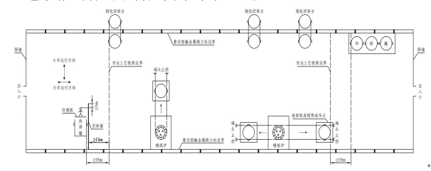 (2)炼钢厂、铁合金厂的会议室、活动室、休息室、操作室、交接班室、更衣室(含澡堂),设置在熔融金属吊运跨距离吊运工艺极限边界50米以内的地坪区域(纵向两端方向,图4-3)。