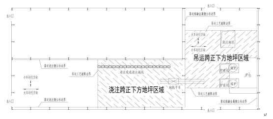 (1)炼钢厂、铁合金厂的会议室、活动室、休息室、操作室、交接班室、更衣室(含澡堂),设置在熔融金属吊运行走区域的正下方地坪区域。注:“正下方地坪区域”是指横向以吊运跨两侧立柱靠近熔融金属吊运侧的立柱边线为界,纵向以吊运跨最两端的铁水、钢水、液渣吊运工艺极限边界为界的车间地坪区域(图4-2)。“吊运工艺极限边界”是指因生产工艺需要,铁水罐、钢水罐、液渣罐(包、盆)位于兑装位、倒罐位、钢包回转台、浇铸位或者地面轨道极限起吊点时,吊运跨纵向靠近最两端方向的罐(包、盆)外壁到达的垂直边界位置(冶金企业下同)。炼钢连铸的铸余渣罐(包、盆)位于起吊点时的外壁不视为熔融金属吊运工艺极限边界。