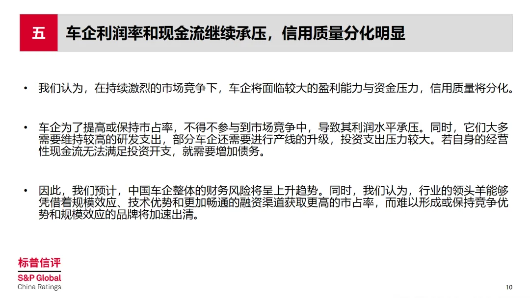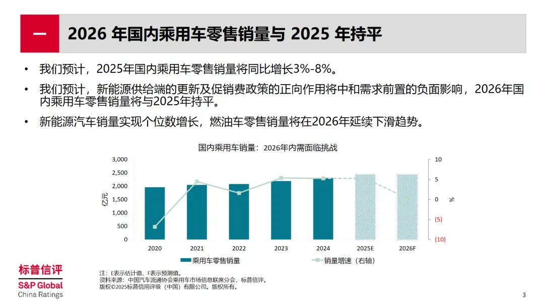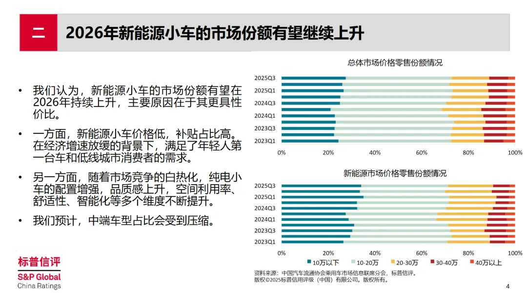 本篇行业报告可以通过扫下方知识星球下载。39元就可以下载星球所有报告。免费提供报告查找服务。随着2026年的临近,中国整车制造行业正站在一个新的起点上。根据标普信评的分析,未来一年,中国乘用车市场将面临销量持平、结构变化、竞争加剧、出口增长和信用质量分化五大趋势。首先,销量方面,预计2026年国内乘用车零售销量将与2025年持平,新能源汽车销量实现个位数增长,而燃油车销量将继续下滑。这一趋势反映了新能源汽车市场的强劲增长和燃油车市场的逐渐萎缩。结构上,新能源小车市场份额有望继续上升,尤其是在10万元以下的价格区间,因其高性价比受到市场的青睐。这将对中端车型形成挤压,市场竞争将进一步白热化。竞争方面,行业利润率短期内仍将承压,产能过剩是主要原因。落后产能的淘汰和产线调整将是缓解竞争、修复企业利润水平的关键。部分品牌已经开始关闭国内工厂,预示着产能出清的开始。出口方面,尽管贸易保护主义抬头带来不确定性,但预计2026年乘用车出口仍将保持5%-10%的增长。中国车企及产业链的技术、规模优势,以及海外本土化生产能力的提升,将有助于缓解这些挑战。最后,车企的盈利能力和现金流将继续承压,行业信用质量分化明显。新能源汽车的蓬勃发展改变了市场竞争格局,对合资品牌依赖度高的车企销量和市占率下滑,而新能源布局较早的车企则销量和市占率大幅提升。综上所述,中国整车制造行业在2026年将面临一系列挑战和机遇。企业需要通过技术创新、市场拓展和产能优化来提升竞争力,同时应对市场变化和信用风险。在这个过程中,行业的领导者将凭借规模效应、技术优势和融资渠道获得更高的市场份额,而难以形成竞争优劣势的品牌将加速退出市场。免责声明:以上分享报告为公开合法渠道获得,内容大部分来源于网络,版权归原作者所有,如有侵权,请及时与我们联系,我们将第一时间保障您的权益。推荐内容仅供参考学习,不构成投资建议。