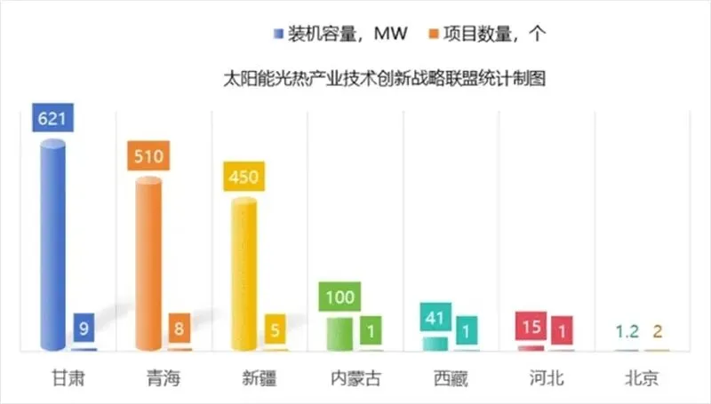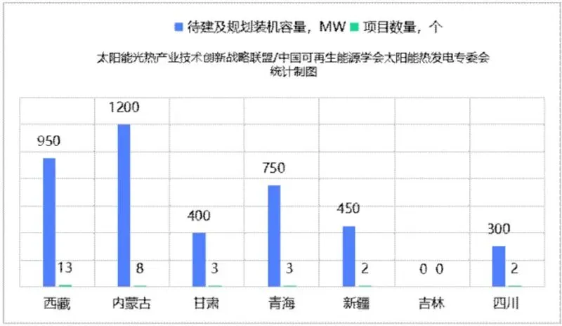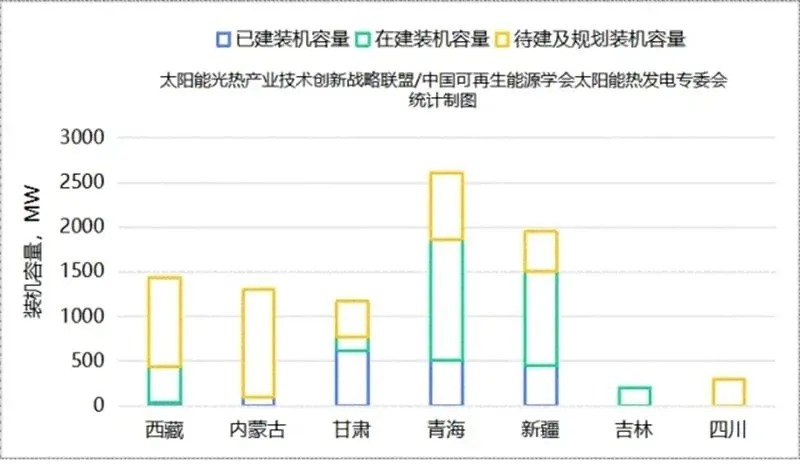 2025年1月1日起实施的《中华人民共和国能源法》第二十五条规定:“积极发展光热发电”,这为光热发电的持续发展奠定了法律根基。2025年国家相关部门共发布太阳能热发电相关政策文件十余项。其中,2025年12月23日,国家发展改革委 国家能源局联合印发的《关于促进光热发电规模化发展的若干意见》(发改能源〔2025〕1645号)是专门性文件,其中明确提出,光热发电是实现新能源安全可靠替代传统能源的有效手段,是加快构建新型电力系统的有效支撑。充分发挥光热发电对新型电力系统的支撑调节作用。挖掘光热发电作为绿色低碳基础保供电源潜力,推动光热的系统保供价值转化,提高新型电力系统绿色可靠支撑容量比重。支持配置电加热系统的光热电站通过电力市场发挥系统长时储能电站功能。《蓝皮书》介绍,太阳能热发电是将太阳辐射转化为热能,通过热功转换过程发电的系统。太阳能热发电聚光形式主要包括塔式聚光、槽式聚光、线性菲涅尔式聚光、碟式聚光、轮式聚光、旋转塔式聚光、二次和多次反射式聚光、透射式聚光等八种。在装机容量方面,《蓝皮书》显示,2025年,我国新增并网光热电站9座、总装机容量900MW。截至2025年底,我国建成光热电站/系统27座、累计装机容量1738.2MW(含首座200kW超临界二氧化碳光热发电基础研究实验系统),较2024年增长107%,位居全球第三;其中,并网光热发电机组容量1720MW。根据太阳能光热产业技术创新战略联盟/中国可再生能源学会太阳能热发电专业委员会统计,处于实质性建设阶段的光热发电项目约25个,总装机容量3000MW;其中,两座350MW独立光热电站于2025年底启动建设。我国待建及规划的太阳能热发电项目数量约31个、总装机容量约4050MW(不包括尚未明确装机容量的项目)。图:我国已建光热发电累计装机容量(截至2025年)在各省区光热电站建设情况方面,太阳能光热产业技术创新战略联盟/中国可再生能源学会太阳能热发电专委会统计,截至2025年,甘肃省累计装机规模最大(621MW,含兰州大成1MW屋顶线菲式光热发电系统),青海省次之(510MW),新疆位居第三(450MW)。在建的光热发电项目方面,青海省在建光热发电装机规模最大,达到1350MW;新疆次之(1050MW);西藏位居第三(250MW)。太阳能光热产业技术创新战略联盟/中国可再生能源学会太阳能热发电专委会根据公布的信息以及初步核实发现,内蒙古、西藏和青海宣布待建和规划的光热发电装机容量位居前列,总计约3000MW。根据《关于促进光热发电规模化发展的若干意见》提出的目标:到2030年,我国光热发电发展总装机规模力争达到15000MW左右,在现有所有项目基础上(假设待建规划项目均落地),未来5年还需要开发建设光热发电项目装机约6000MW。图:2025年底,全球主要国家和地区光热发电累计装机容量达到8800.2MW(含美国20世纪80年代建设、现已退役的8座槽式电站),同比增长11.4%在聚光形式市场占比方面,根据太阳能光热产业技术创新战略联盟/中国可再生能源学会太阳能热发电专业委员会统计,截至2025年底,在我国光热发电累计装机容量中,塔式约占70.82%,槽式约占10.93%,线菲式约占14.50%,二次反射式约占2.88%,类菲涅耳式约占0.86%,超临界二氧化碳式约占0.01%。而国外主要国家和地区中,槽式约占79.97%,塔式约占17.28%,线菲式约占2.75%。在光热发电示范项目运行方面,《蓝皮书》分别列示了首批太阳能热发电示范项目的技术参数和年度运行情况。7座早期建设的光热电站,2025年度总计发电量超过11.789亿kWh。鲁能格尔木多能互补工程50MW塔式光热电站2025年发电量达到1.482327亿kWh,同比增长55.92%。中船新能乌拉特中旗100MW槽式光热电站2025年度发电量达到3.01亿kWh,较2024年增长8.27%。中广核德令哈50MW槽式光热示范电站和首航高科敦煌100MW塔式光热电站2025年度发电量均达到历史新高,同比发电量均提升约3.7%。青海中控德令哈50MW塔式光热电站连续第四年完成年度发电目标。兰州大成敦煌50MW线菲式光热电站2025年度主要开展进一步运行维护策略升级等,项目年发电量提高13.6%。中电建共和50MW塔式光热电站2025年度发电量同比增长6.4%。中电哈密50MW塔式光热电站由于2025年9~10月份机组大修,发电量受到影响,2025年度发电量约1.0299亿kWh。在产业链和产能方面,《蓝皮书》根据企业名称、企业经营范围、企业简介、品牌产品、企业存续等5个要素在专业软件查询得到,我国涉及光热发电的大、中、小及微型企业约6610686家,国有企业10722家,民营企业533771家,外商投资企业3469家,小微企业458861家。产业链中,制造业单位36884家,其中,通用设备制造业4011家,专用设备制造业1460家。在制造能力方面,以平面反射镜产能为例,按照“原则上每100MW电站的镜场面积不应少于80万平方米”的要求粗略计算,我国主要反射镜企业年产能能够支撑约5300MW光热电站的安装。在技术研发和成果认定方面,2025年我国启动的太阳能热发电相关国家重点研发计划项目有4个,处于执行期间的太阳能热发电相关国家重点研发计划项目约13个。在标准方面,截至2025年底,IEC/TC 117共发布太阳能热发电国际标准11项。我国现行光热发电国家标准约33项,处于起草阶段的5项。2025年,国家能源局下达太阳能热发电相关行业标准计划共计24项。截至2025年底,太阳能光热产业技术创新战略联盟共发布联盟标准22项,其中光热发电相关联盟标准14项。2025年,部分太阳能热发电
