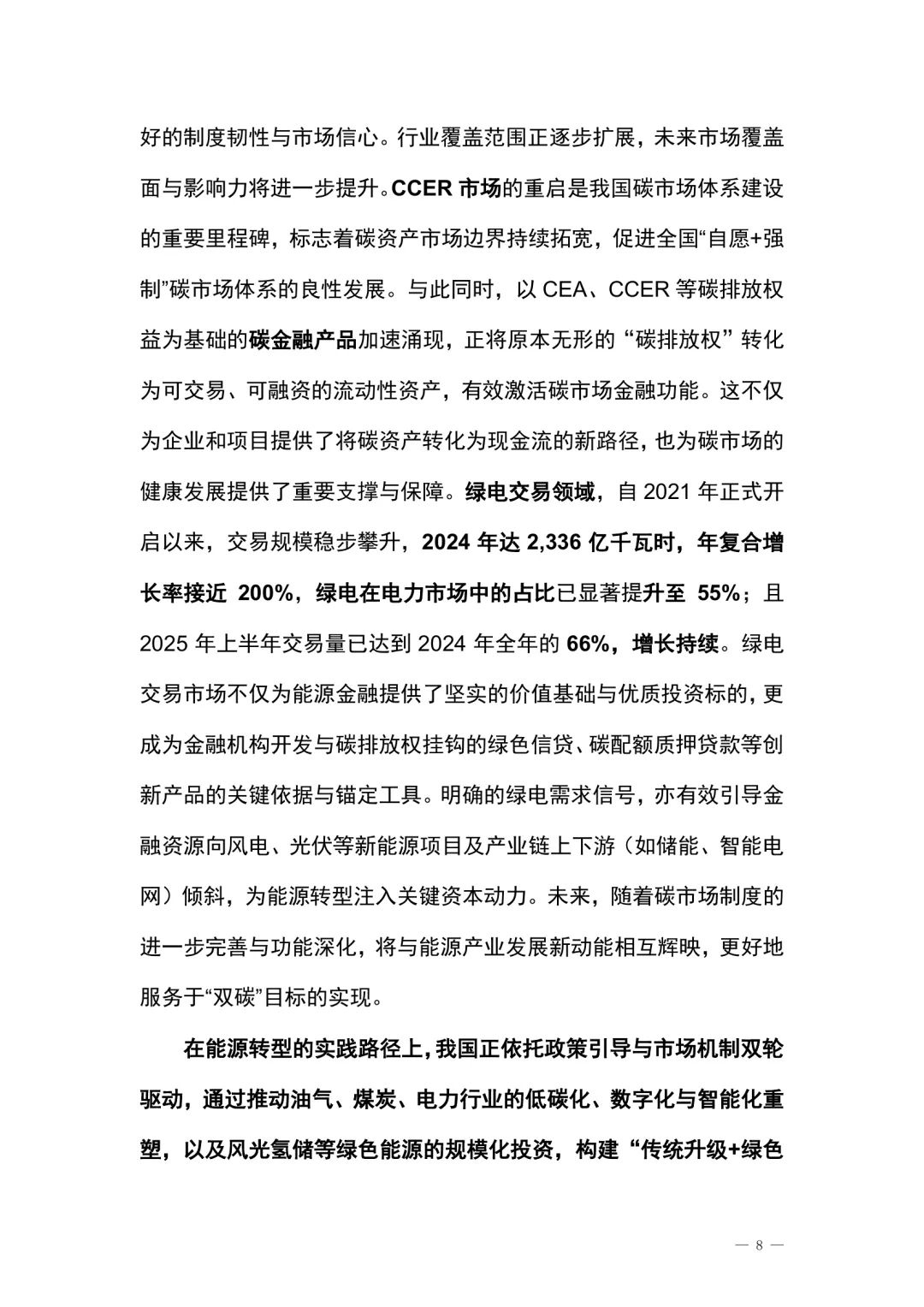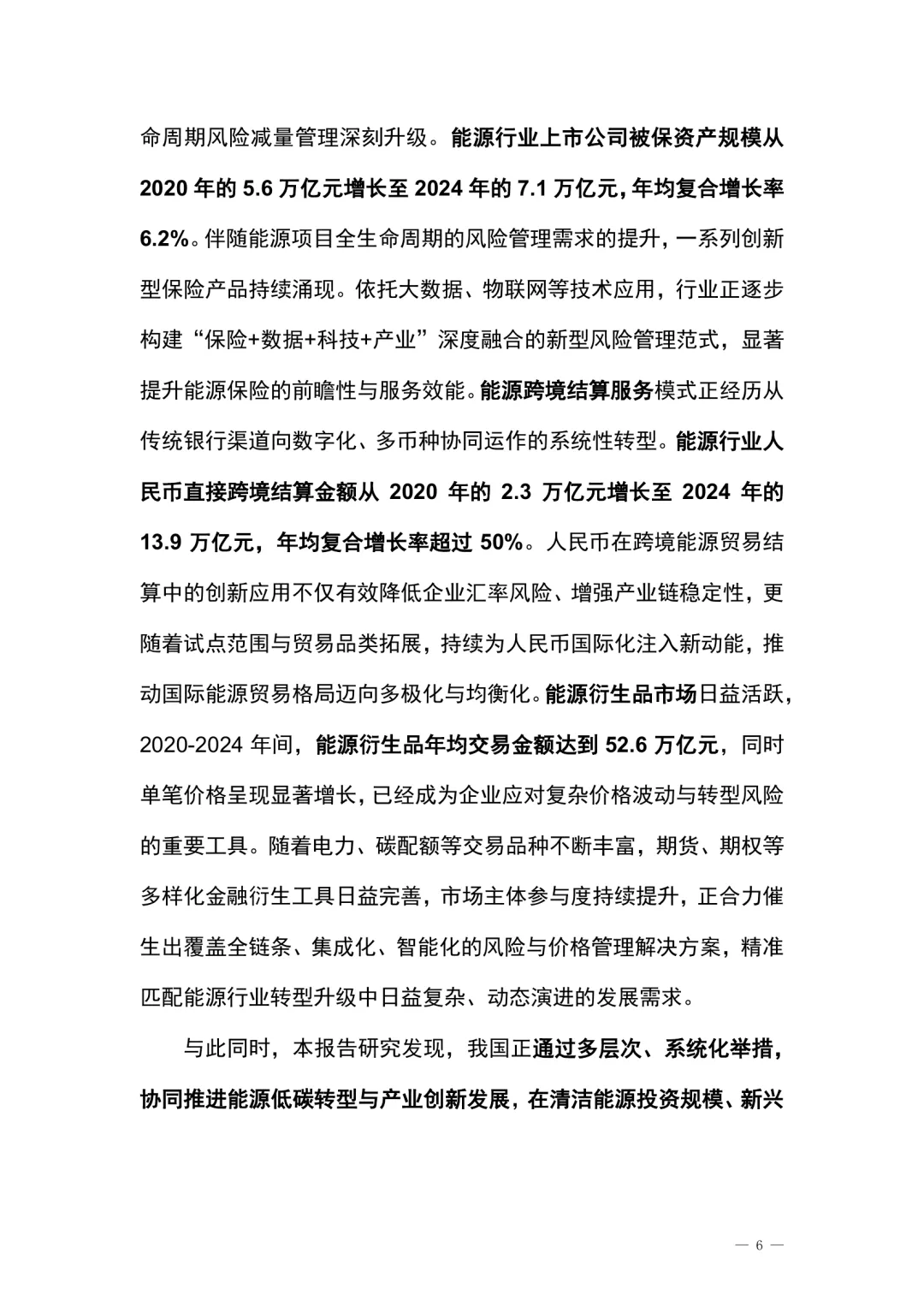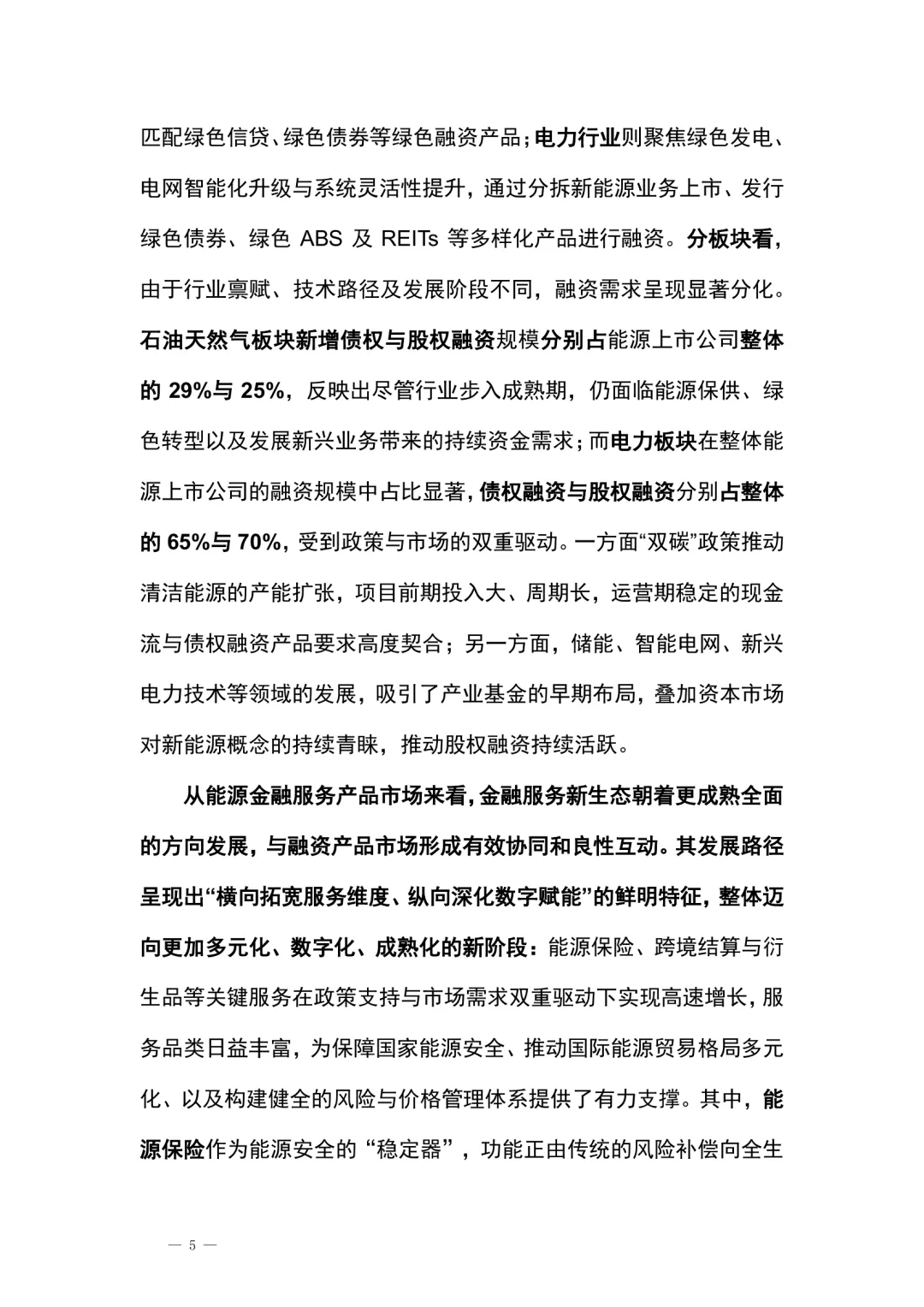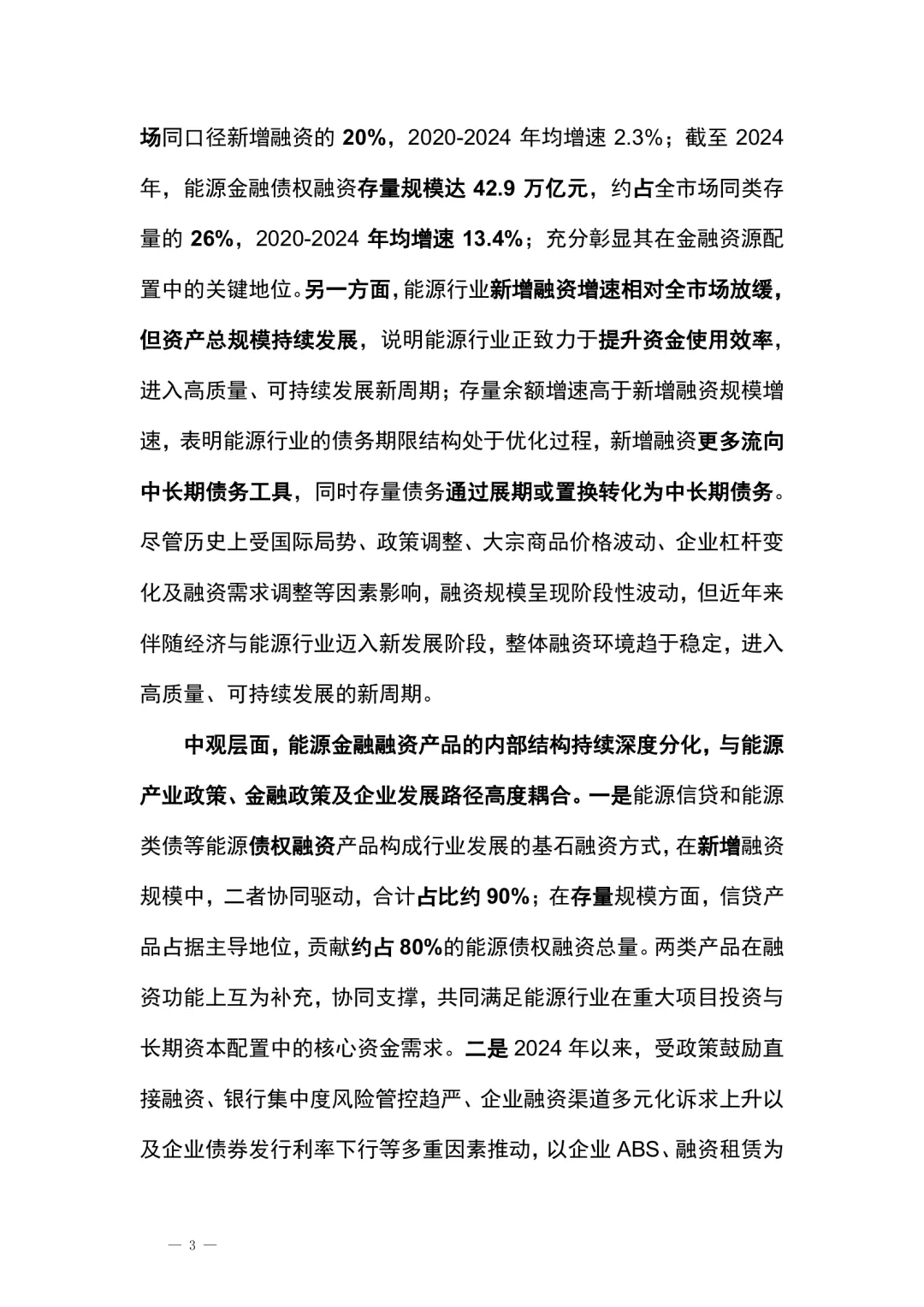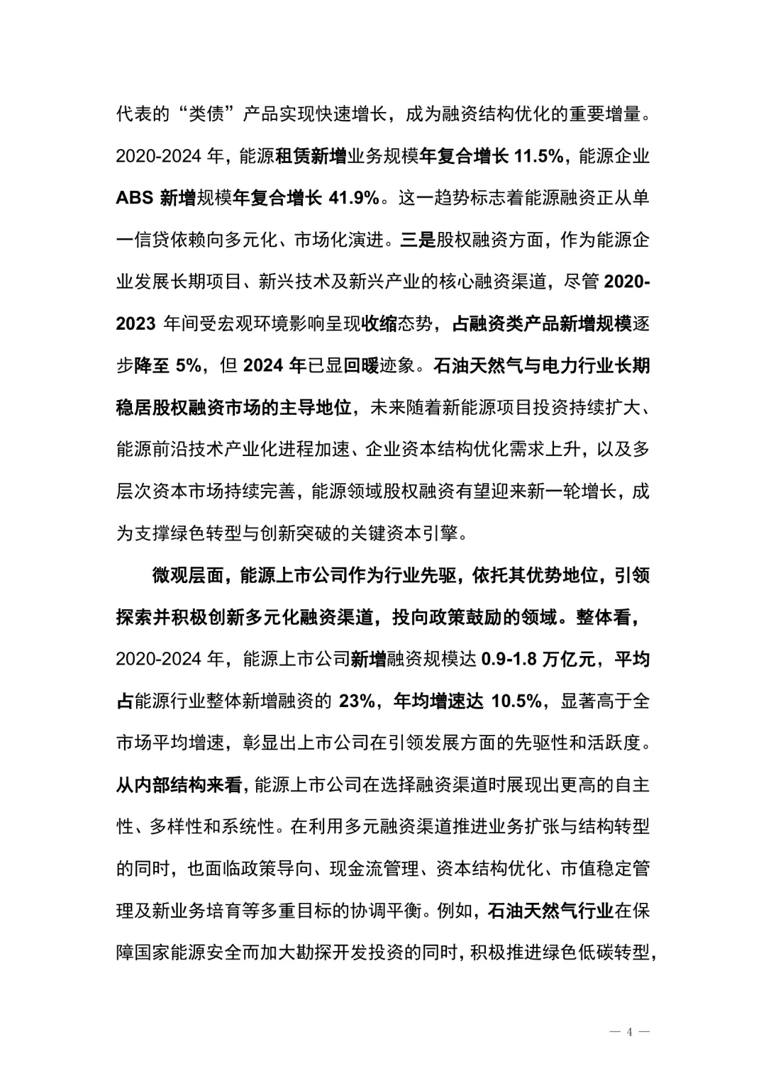 在全球能源格局深刻调整与“双碳”战略深入推进的背景下,能源金融作为连接能源产业与金融资本的重要桥梁,其作用愈发突出。保障国家能源安全是基本战略任务,同时推动能源结构向多元化、清洁化、低碳化转型,成为提升新质生产力和塑造全球竞争力的关键路径。两大战略目标的协同推进,对金融体系的服务能力、创新能力与风险控制能力提出更高要求。能源与金融的深度融合,正成为推动中国式现代化的重要动力。本报告围绕能源金融的发展现状、内在逻辑与未来趋势展开系统研究,从政策、数据、专题到案例,构建起全面的研究框架。通过分析能源金融市场整体图景、规模格局、结构特征与运行机制,评估金融对能源产业的支持效能,并探讨能源与金融之间的双向促进关系,旨在为产业决策、监管实践与市场发展提供科学参考。我国能源金融融资产品与服务体系正在稳步构建,形成宏观、中观、微观层面协同发展的创新格局。宏观层面,能源金融已成为金融体系稳健运行的重要支撑,兼具服务国家战略与维护金融稳定的功能。2020至2024年,能源金融融资类产品新增规模达6.1至6.9万亿元,占同期市场新增融资的20%,存量规模达42.9万亿元,占同类存量的26%。尽管受多种因素影响,融资规模出现阶段性波动,但近年来整体趋于稳定,进入高质量可持续发展阶段。中观层面,能源金融产品内部结构持续分化,与产业政策、金融政策及企业战略高度契合。能源信贷和能源类债券构成行业发展的基础融资方式,占比约90%;企业ABS、融资租赁等“类债”产品快速增长,成为融资结构优化的重要增量。股权融资方面,虽曾因宏观环境收缩,但2024年已显回暖,石油天然气与电力行业长期占据主导地位,未来随着新能源项目扩大、技术产业化加速及资本市场完善,能源领域股权融资有望迎来新一轮增长。微观层面,能源上市公司作为行业先锋,积极拓展多元化融资渠道,投向政策鼓励方向。2020至2024年,能源上市公司新增融资规模达0.9至1.8万亿元,占行业整体新增融资的23%,增速显著高于市场平均水平。在选择融资渠道时,表现出更高的自主性与多样性,同时也面临政策导向、现金流管理、资本结构优化等多重协调挑战。例如,石油天然气行业在加大勘探开发投资的同时,积极推进绿色低碳转型,展现出较强的适应能力与发展韧性。