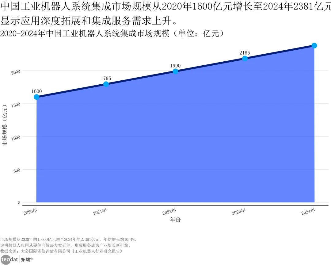 中国工业机器人系统集成市场持续爆发,2020年至2024年规模从1600亿元增至2381亿元,五年增长48.8%,年均增速10.4%。这一增长背后,是制造业从“规模化生产”向“柔性化定制”转型的刚需——传统工业机器人难以适配多品类、小批量生产,而系统集成服务通过定制化方案,实现机器人与现有产线深度融合,成为产业升级的关键支撑,其市场占比已从35%提升至47%,成为行业增长主力。