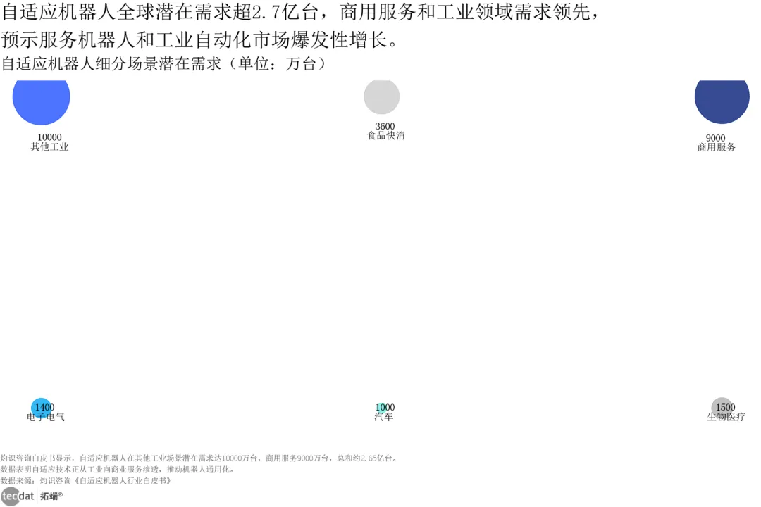 机器人商业化落地遵循“工业先行、服务跟进”的清晰路径。工业场景中,搬运、质检等短链条任务已实现规模化应用,预计2035年中国汽车制造、电子制造、物流仓储三大领域人形机器人需求量达48.4万台,市场空间483.6亿元;自适应机器人在电子电气、汽车、家电等场景潜在需求超27000万台,成为缓解劳动力短缺的关键解决方案;服务场景虽仍处于试点阶段,但商业演出、建筑施工等场景已显现潜力,未来增长空间广阔。