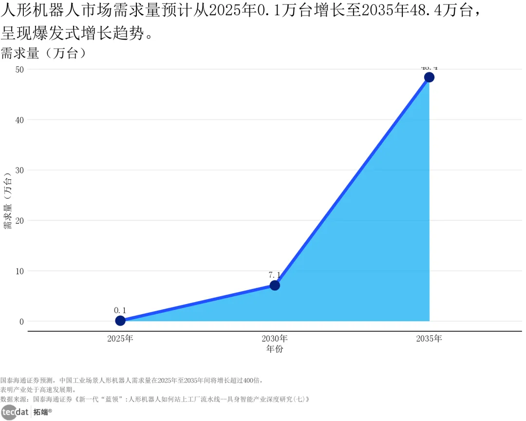 自适应机器人细分场景潜在需求气泡图表5数据EXCEL及图表PDF模板已分享到会员群3秒解读:工业场景是当前主要增量市场,服务场景未来潜力巨大,双场景协同驱动产业增长。对应人群行动建议:企业可优先布局工业搬运、质检设备,快速实现盈利;创业者可探索餐饮、康养等服务场景的轻量化解决方案,避开红海竞争。从人形机器人市场需求量来看,2025-2035年需求量呈填充式增长,2030年突破7万台,2035年达48.4万台,工业场景是核心驱动力。