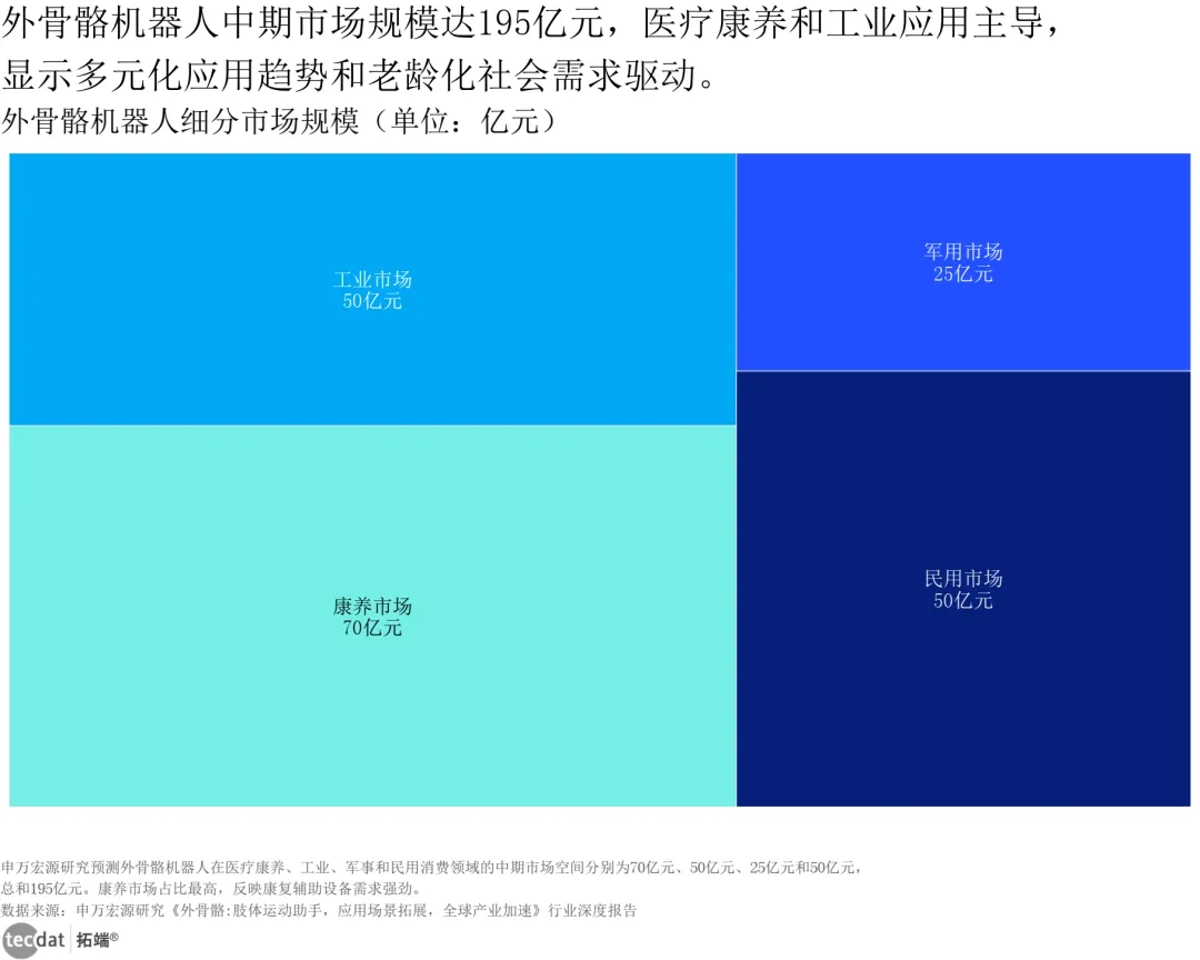 外骨骼机器人细分市场规模树状图表4数据EXCEL及图表PDF模板已分享到会员群3秒解读:医疗康复是外骨骼核心场景,市场规模占比超60%。对应人群行动建议:创业者可聚焦医疗康复外骨骼,政策支持+需求刚性;企业可与医院、康复机构合作,快速实现场景落地。