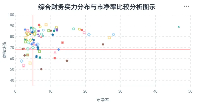 在公司的发展能力、经营稳定性及增长潜力的基础上,结合公司主营业务所属行业的分析、资产结构或资产质量分析、主营业务运营效率分析、受评主体的行业地位分析以及偿付能力的分析做出的公司综合财务实力分析判断。分数越高,公司的综合财务实力越强。处在右下区域的公司,市净率较高且相关指数较低,则存在公司综合财务实力不足的潜在风险。